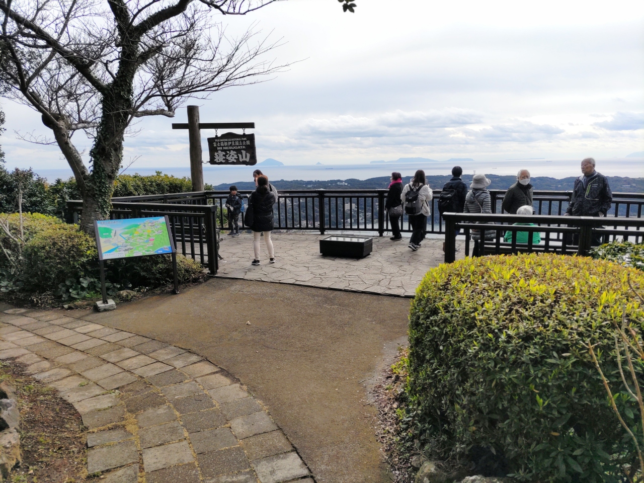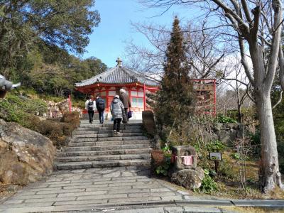 寝姿山は、女性が横たわる姿に似ていることからその名がついたという。寝姿山自然公園内には遊歩道が整備され、展望台からは、下田湾や伊豆諸島など雄大な景色が楽しめる。寝姿山自然公園には、「縁結び」の愛染明王堂や黒船見張り所、蓮杖写真記念館(休館中)、ハーブ園などがある。2月下旬、ギンヨウアカシアや河津桜の花が満開だった。また、小さな池には珍しい「ヒレ長錦鯉」が泳いでいた。