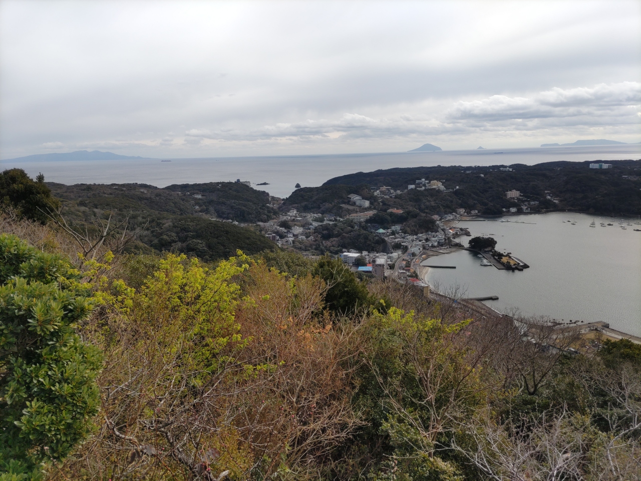 - 東伊豆の町々、相模湾、伊豆大島が見える。