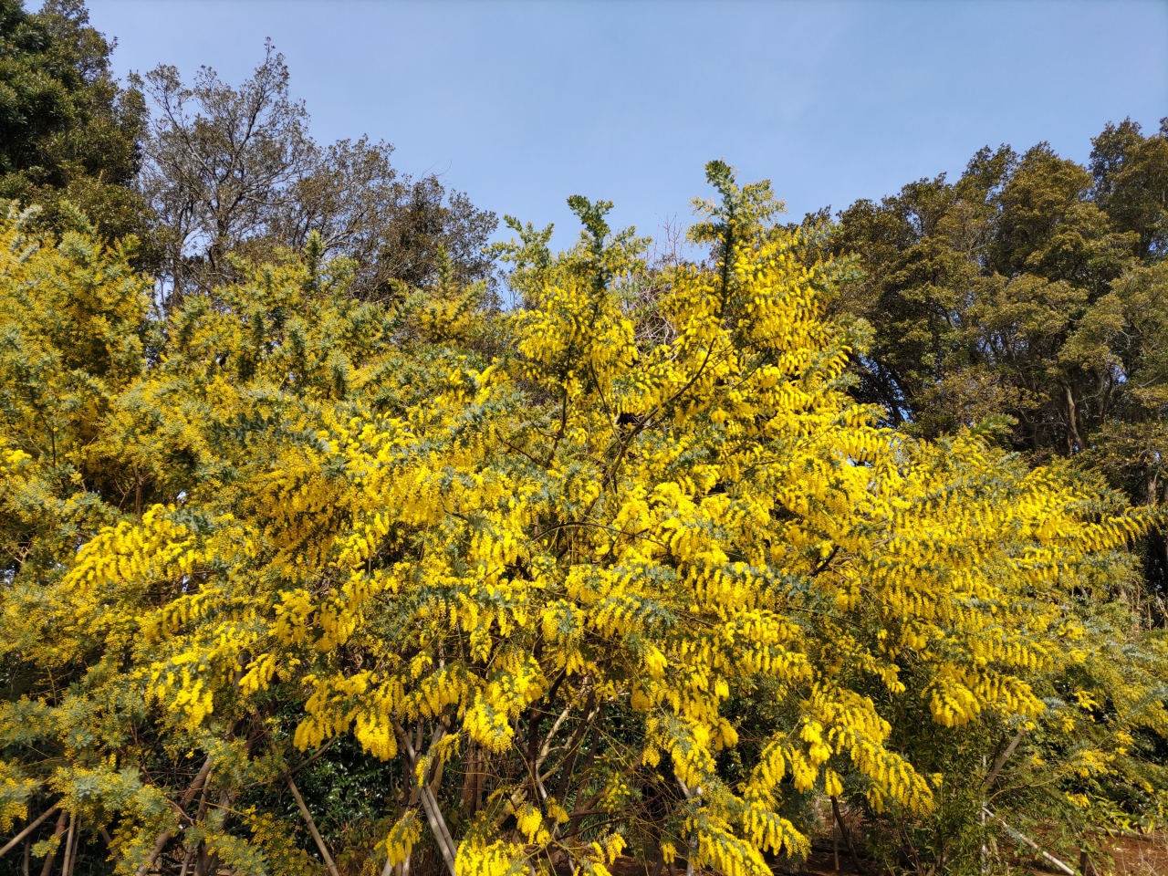 頂上付近は自然公園。ギンヨウアカシアや河津桜の花が満開、雄大な景色を満喫