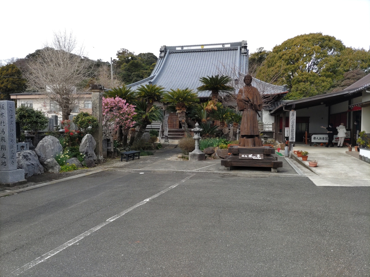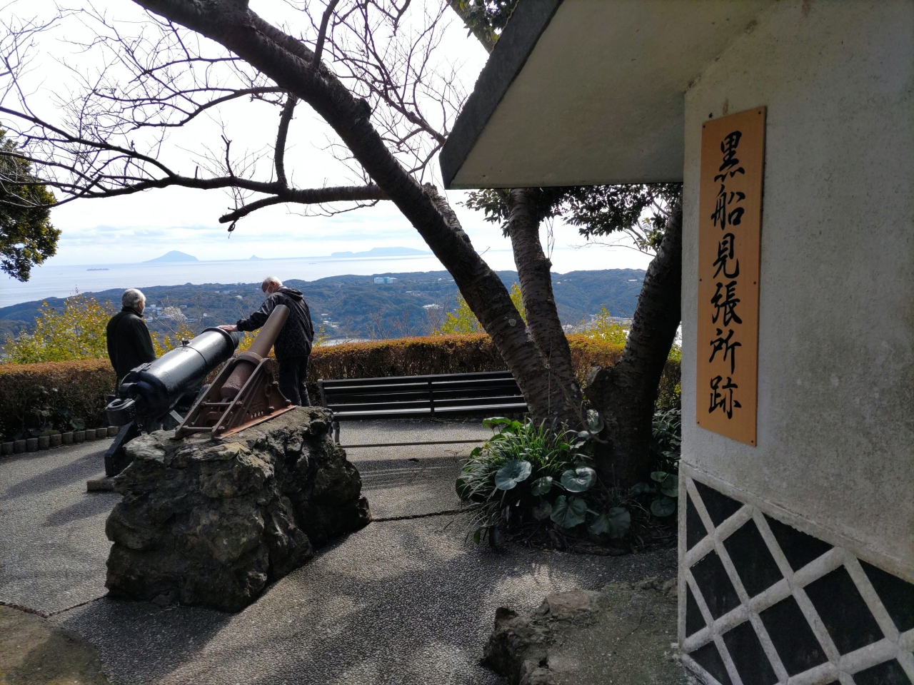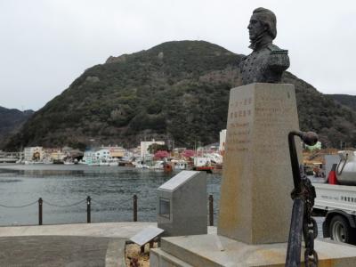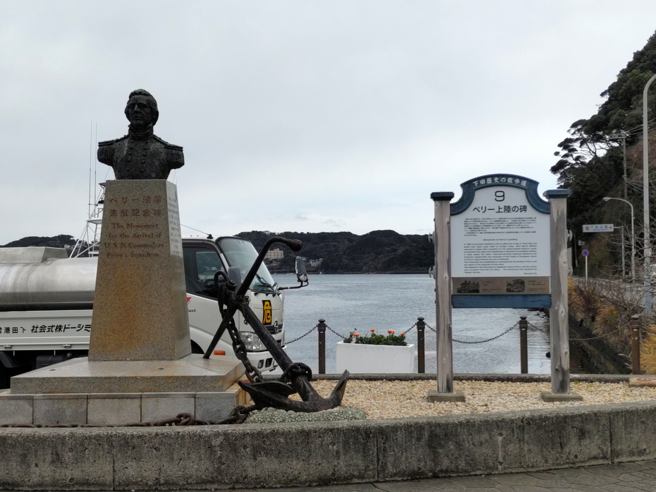 ペリーロードの東端、旧澤村邸(無料休憩所・トイレ)から北に約50m歩くと、下田港が見えてくる。ここからさらに東に約50m歩くと、小さなペリー上陸記念公園があり、マッシュー・ペリー提督の胸像と、アメリカ海軍から寄贈された錨が飾られている。胸像は彫刻家村田徳次郎制作、メッセージプレートは第4代米国大統領ジョージ・ブッシュから贈られたものである。2月下旬、この公園のベンチに座って、寝姿山や下田港を見ながらひと時を過ごした。近くには満開の河津桜が咲いていた。