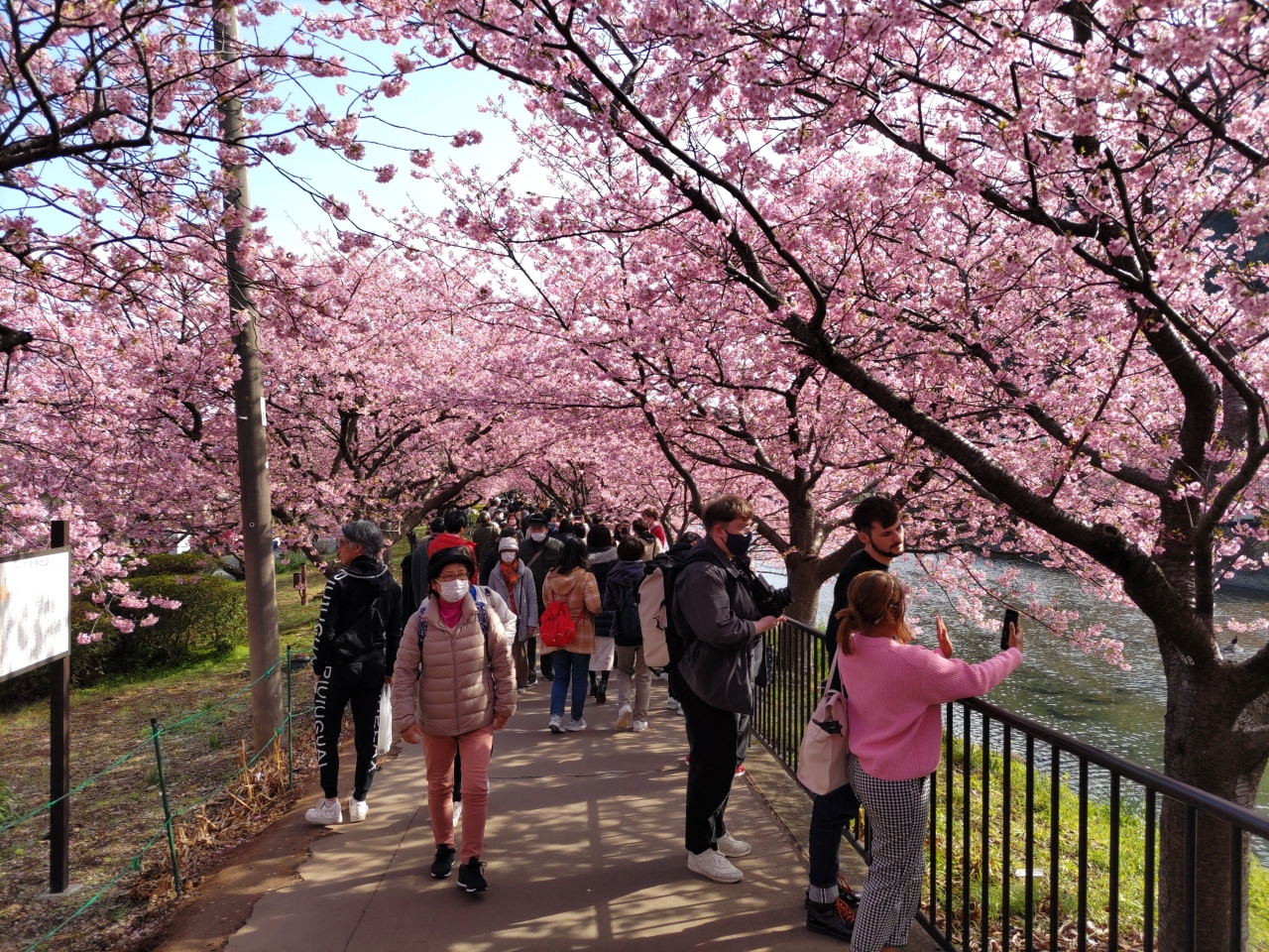 河津桜まつりは多くの人で賑わう。河津川沿いの桜並木は見事!