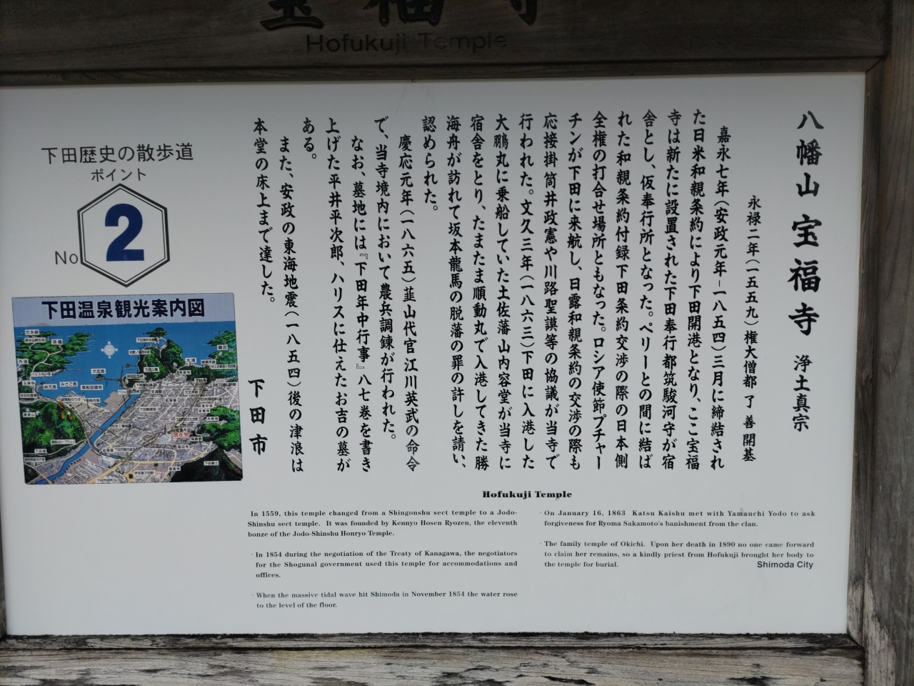 下田駅からマイマイ通りを南に200mほど歩くと、右側(西側)に坂本龍馬の立像が見え、その奥に浄土真宗本願寺派の寺院、宝福寺がある。土佐藩主山内容堂と勝海舟が会談した寺で、会談後に、勝海舟は門人の坂本龍馬が犯した土佐藩脱藩の罪が許されることになったという。本堂に向かって左側にその碑がある。この寺は、斎藤きち(唐人お吉)の墓があることで知られており、「唐人お吉記念館」(有料)にはお吉所縁の品々を所蔵している。