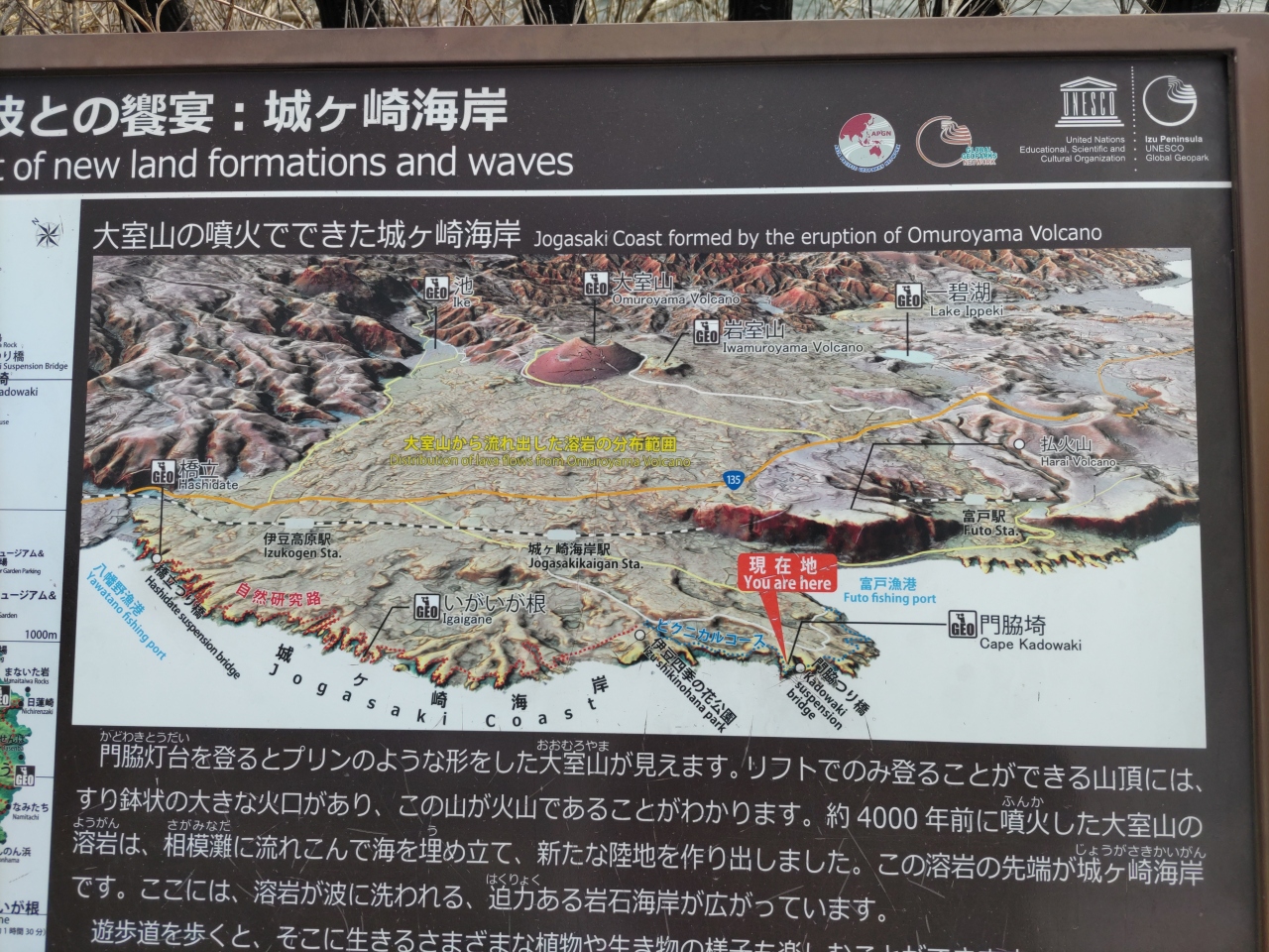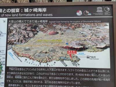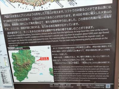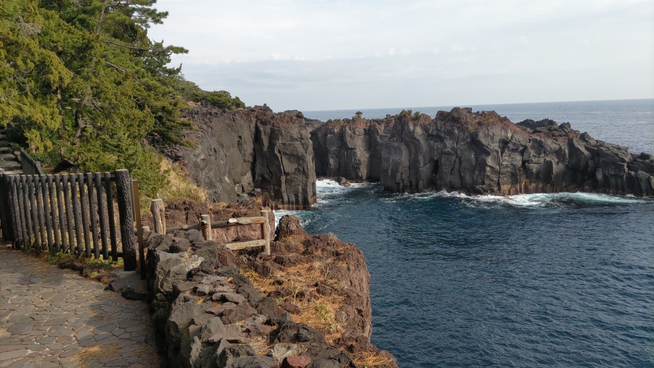 城ケ崎海岸駅を起点・終点とする約2時間のハイキングを楽しんだ。大室山噴火の溶岩が海に向かって流れ、それが波によって浸食され、ゴツゴツとした岩肌が露出する複雑な海岸地形・景観をつくりだしている。そして、広大な海が広がる。断崖絶壁にそってハイキングコースが整備され、心地よい潮風を受けながら歩くのはとても気持ちが良かった。なお、運動靴など歩きやすい靴があった方が良い。