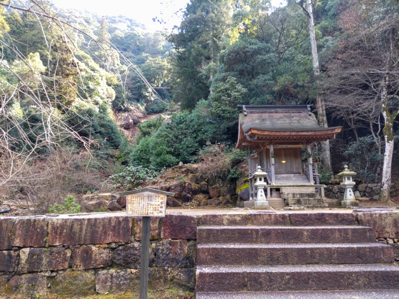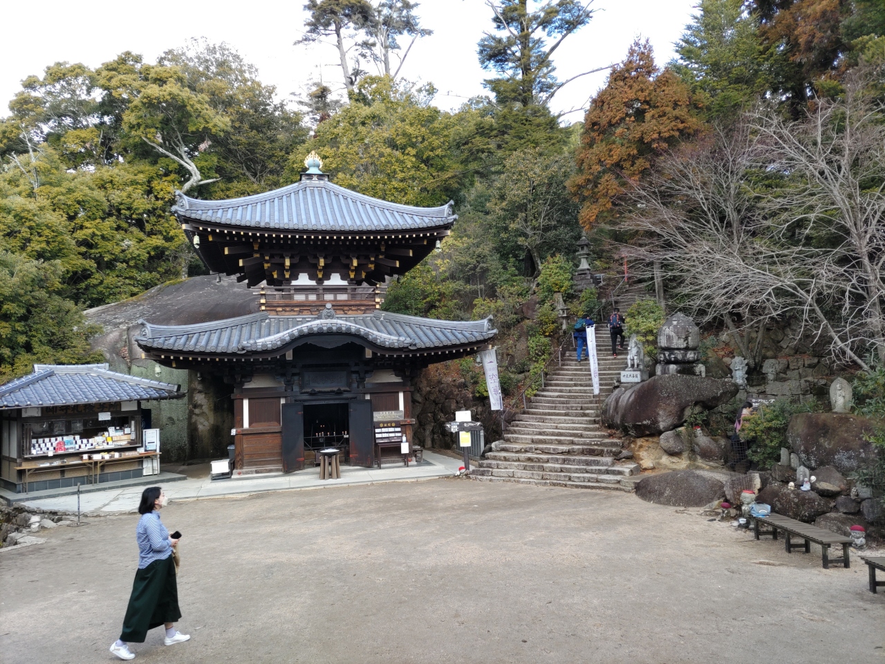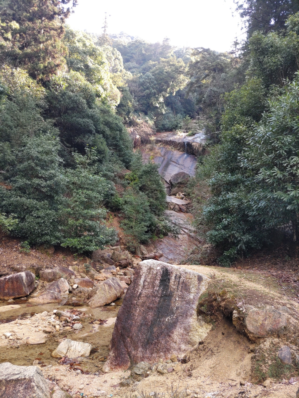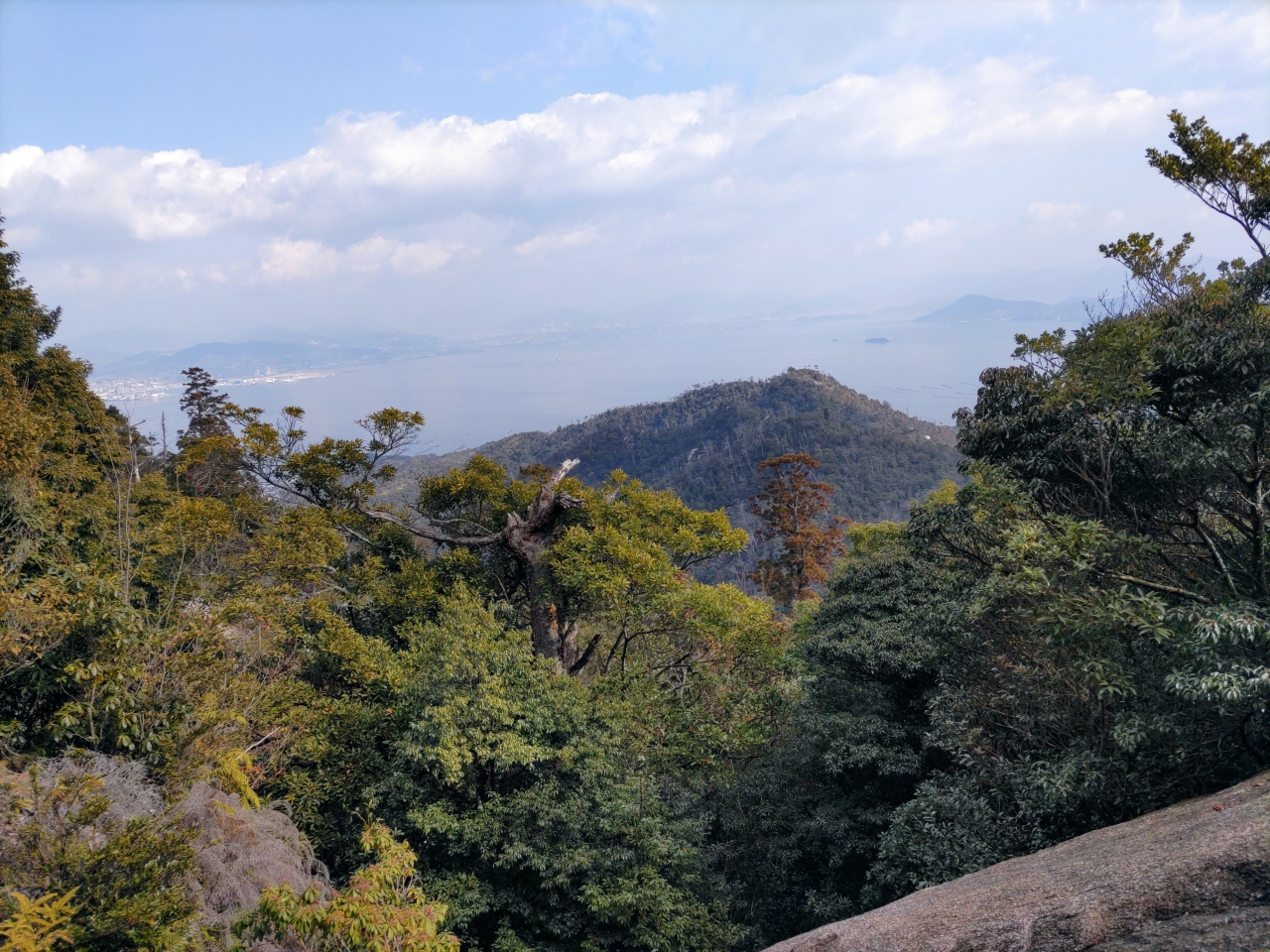 紅葉谷コースを登り弥山頂上へ、下りは弥山本堂前から、仁王門を通って大聖院コースを下った。10数年前に登山したときは、このコースは台風による豪雨のため崩壊しており、大元公園コースを下ったが、現在は幅2m弱の石段の道が整備されている(ただ、急な石段が続いたため翌日は両足が筋肉痛になった)。途中、多くの登山者とすれ違ったが、そのほとんどは西洋人で、「こんにちは」と日本語で挨拶をしてくれ、爽やかだった。大聖院近くまで下ると、瀧宮神社があり、その背後に白糸の滝が見えるが大したことはない。むしろ滝の奥にある花こう岩の一枚岩がすごい。