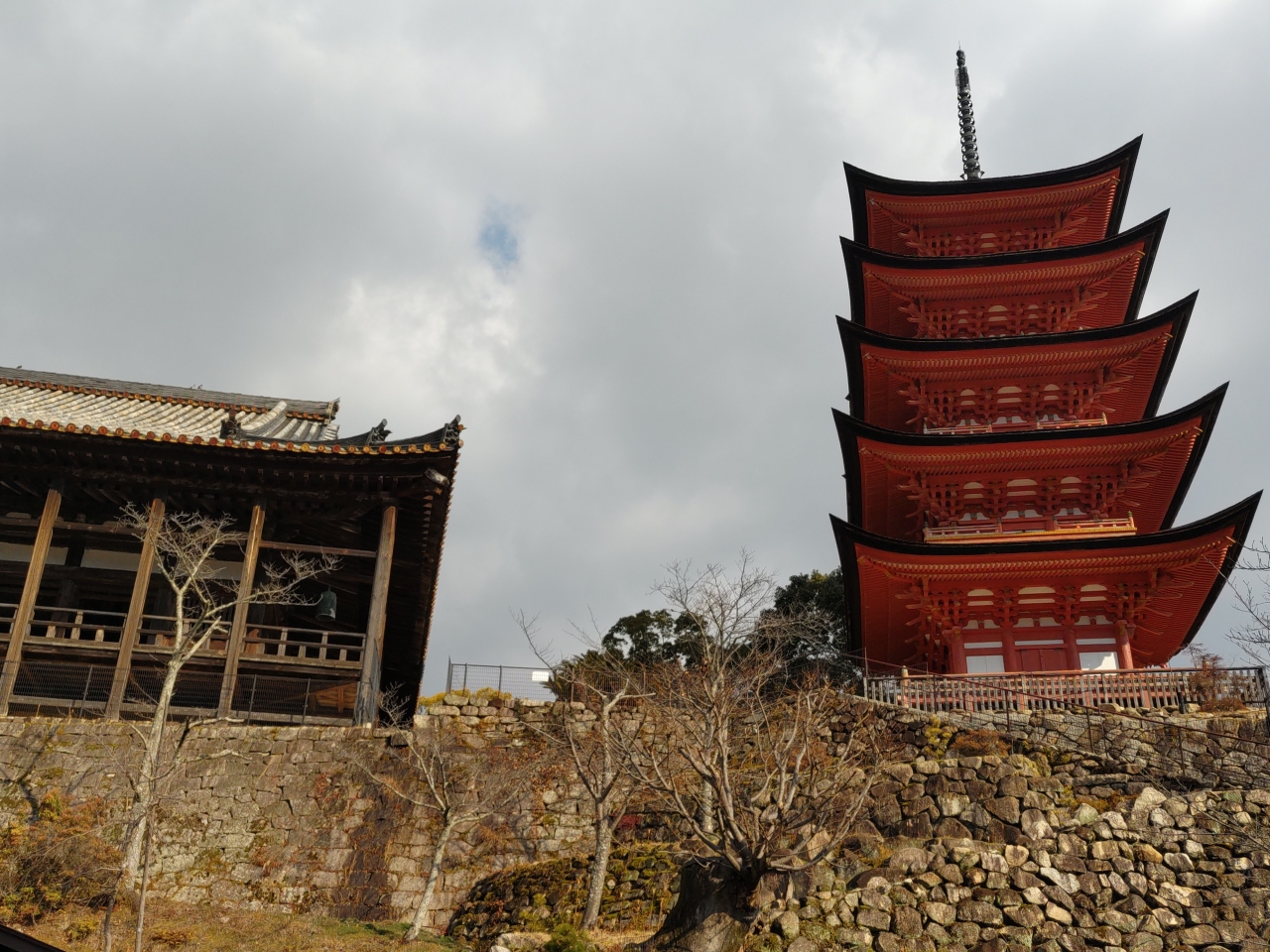 宮島桟橋から西に約20分歩いて、厳島神社の南側の道に入ると、左手の小高い丘に千畳閣(豊国神社)と五重塔が見える。いずれも国の重要文化財である。五重塔は高さ約28m、桧皮葺で和様・唐様を融合した見事な建物で、晴天の日には、五重塔の朱色が青空に映えてとても綺麗である。本尊の釈迦如来などは、明治の神仏分離で大願寺に移されたそうである。千畳閣は、豊臣秀吉が建立した大経堂で、入母屋造りの大伽藍で857畳の畳を敷くことができる。以前、訪れたとき堂内に「算額」があり、しばし「頭の体操」をした。
