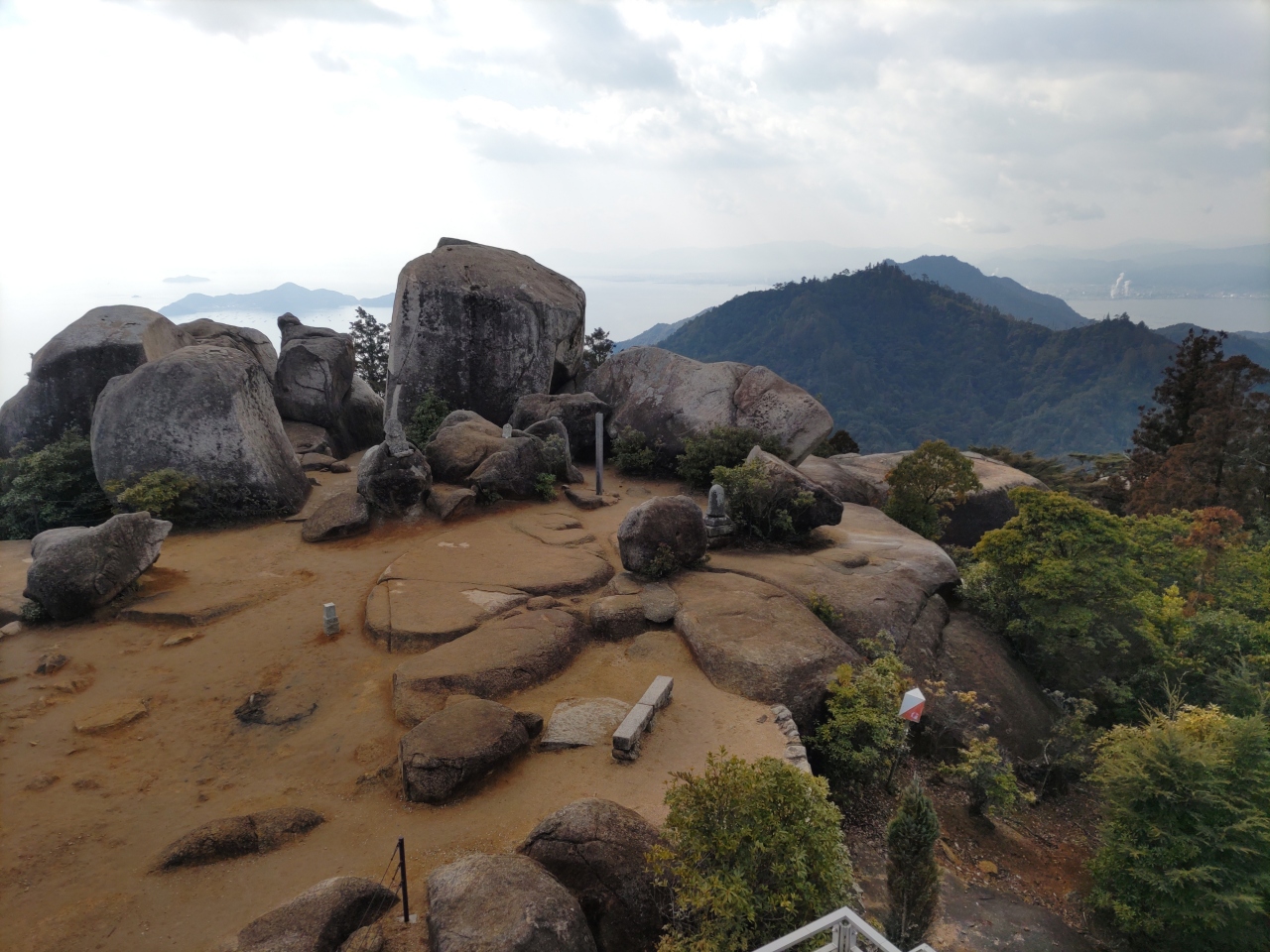 弥山は広島県廿日市市の宮島の中央部にある原生林に囲まれた標高535 mの山で、古くからの信仰の対象になっている。主な登山コースは、紅葉谷、大乗院、大元公園の三つがあり、麓から1時間あまり登頂できる。宮島ロープウェイを利用すれば、獅子岩駅から徒歩20分あまりである。頂上付近には花こう岩の巨岩や奇岩が点在し、頂上には展望台が設置されており、絶景を楽しむことができる。以前は、野生の猿が沢山いて近寄ってきていたが、今は全く遭遇しない。