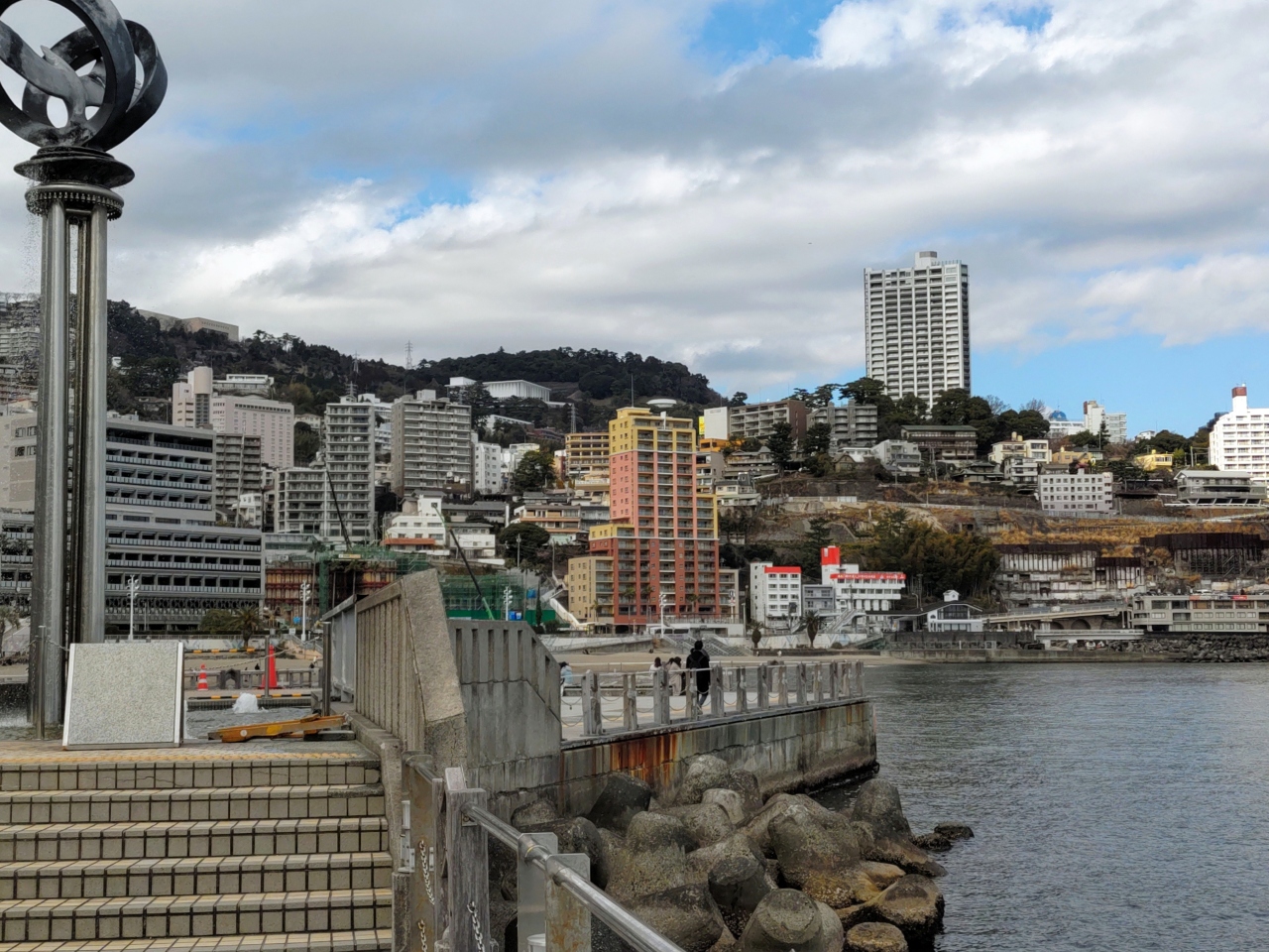 熱海駅から南に10分あまり歩くと海岸に到着する。海岸の北東側に、熱海サンビーチの砂浜が続き、砂浜と国道135号の間に「お宮の松」がある。サンビーチの南の端が「ムーンテラス」で、ここから南西に熱海親水公園の遊歩道が続いている。ところどころにベンチがあり、そこから相模湾に浮かぶ初島や遠く伊豆大島をのぞむことができる。熱海城も見える。心地よい風が吹いて、とても気持ち良い(季節にもよるが)。ジョギングや子犬を連れて散歩している地元の人も結構多い。公園の南に伊豆大島や初島に向かう船舶や遊覧船の乗場がある。