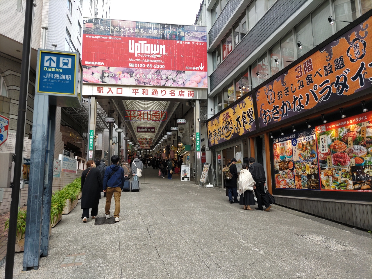 熱海駅を出てすぐ南、線路にほぼ並行したアーケードのある200mあまりの商店街である。海側には並行して仲見世商店街がある。緩やかな下り坂を進んで商店街を出ると、市街地・熱海海岸に向かう車道である。和菓子屋やレストラン、土産物屋、ハンバーガー、果物屋、アクセサリー店などいろいろな店が並び、南の出口付近にはファミリーマートもある。コロナ感染が少し落ち着いたせいか、平日にもかかわらずもの凄い人出で、行列の出来ている店もいくつかあった。