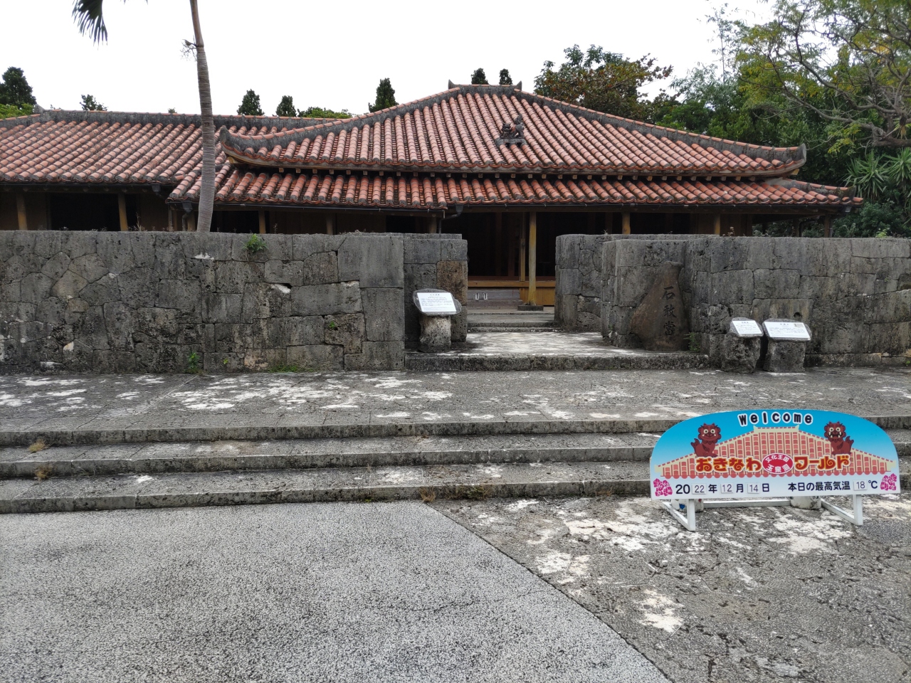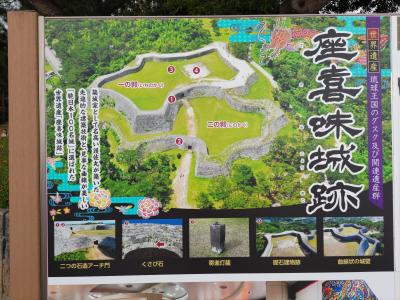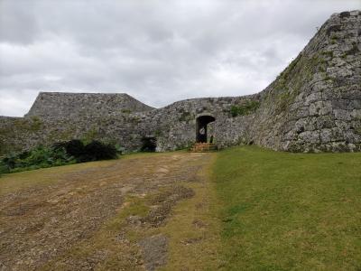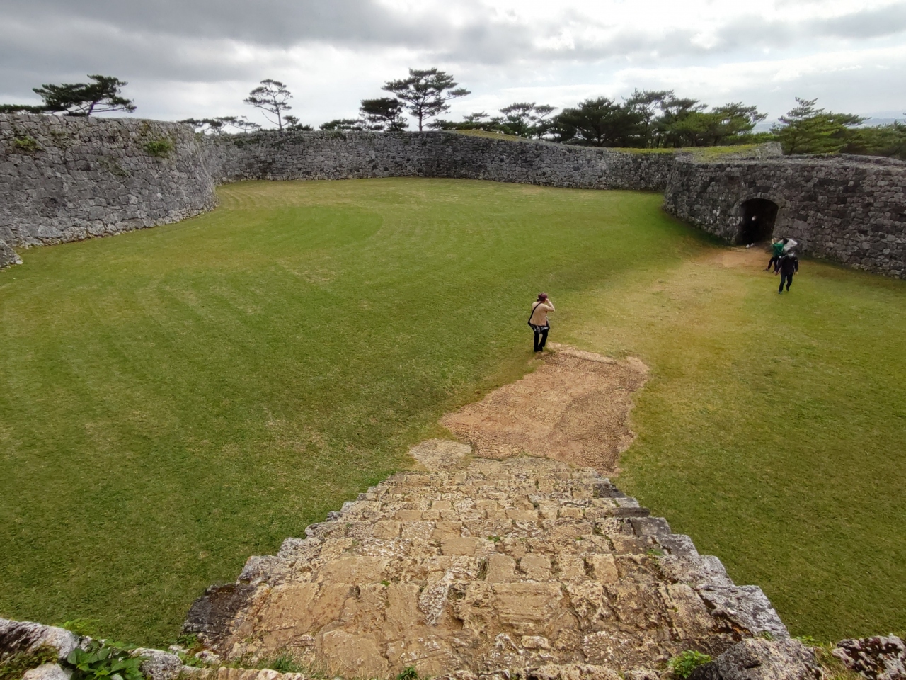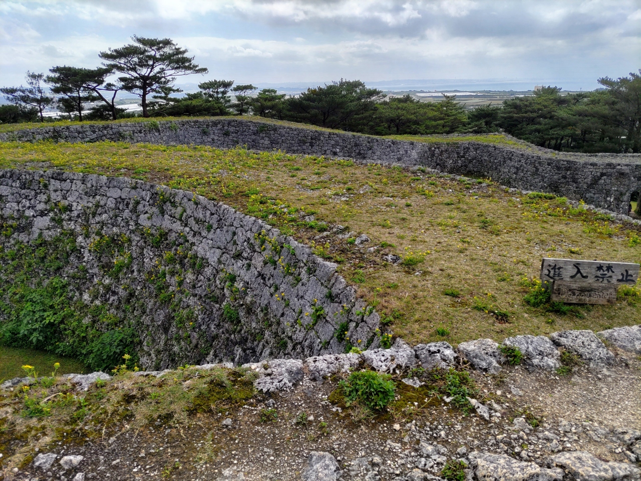 残波岬の帰り、世界遺産「座喜味城跡」を訪れた。座喜味城は、十五世紀初頭に琉球王国が日本や中国、東南アジア諸国と交易していたときに建築されたものである。城跡への車道は南から北方向への一方通行になっている。駐車場に車を停め、緩やかな坂を登っていき、石造アーチ門を二つ抜けると「一の郭」の広場に出る。そこから階段を登ると、曲線状の城壁の上に到着する。城壁は一の郭を取り囲むように一周しているが、西半分は通行止めである。読谷村のほぼ全域を眺望することができる。