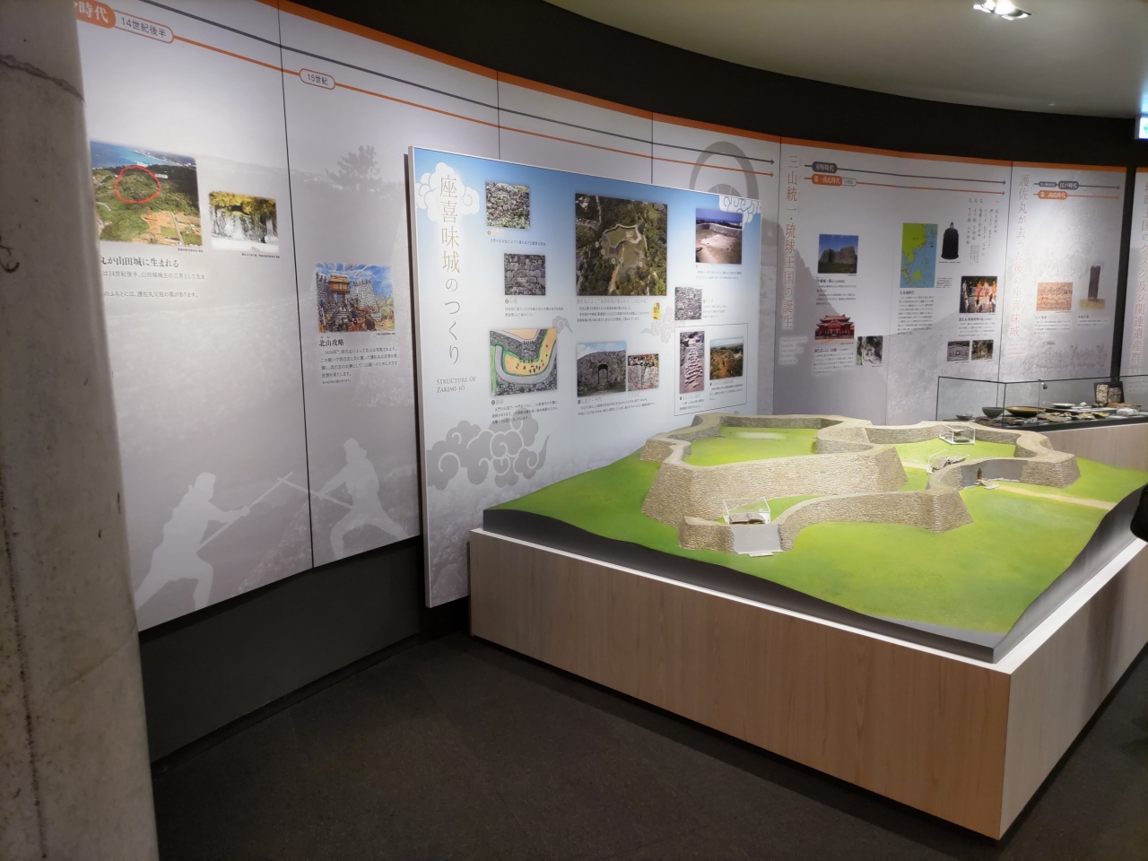 座喜味城跡見学の後、ユンタンザミュージアムに入った。1階は琉球と読谷、座喜味城の歴史に関する展示室(無料)、2階の展示室は読谷の自然、歴史、文化、戦前・戦後の暮らしについて紹介しており、沖縄戦で防空壕として使われたガマも再現されている。3階は琉球陶器の人間国宝 故・金城次郎の作品などが展示されている。観覧料金は大人500円、65歳以上400円である。座喜味城跡とともに是非見学したい。