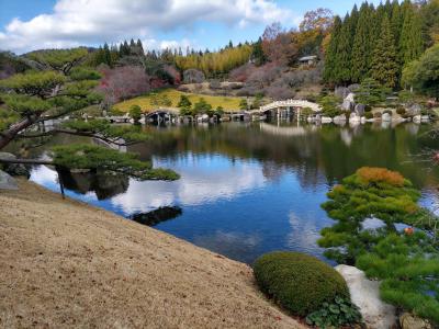 三景園は広島空港の北側に隣接した約6ヘクタールの築山池泉回遊式庭園である。空港開港を記念してつくられたもので、中国山地の渓谷や山をイメージしたゾーン、賀茂や世羅台地などの里山をイメージした里のゾーン、瀬戸内海や景勝地の宮島をイメージした海のゾーンからなる。広島の山・里・海の三つの風景にちなんで「三景園」と名付けられている。広島空港県立駐車場に車をおいて5分あまり歩くと正門・受付である(正門前には身障者用駐車場のみ)。正門を入ると、宮島をイメージした舞台が池に伸びてとても綺麗だ。右回りに池を一周すると、途中県北の三段峡をイメージした滝があり、散策には絶好のコースである。今回は、さらに北に広がる初冬の里山ゾーンを歩いた。なお、65歳以上のシニアは入園料が無料である。