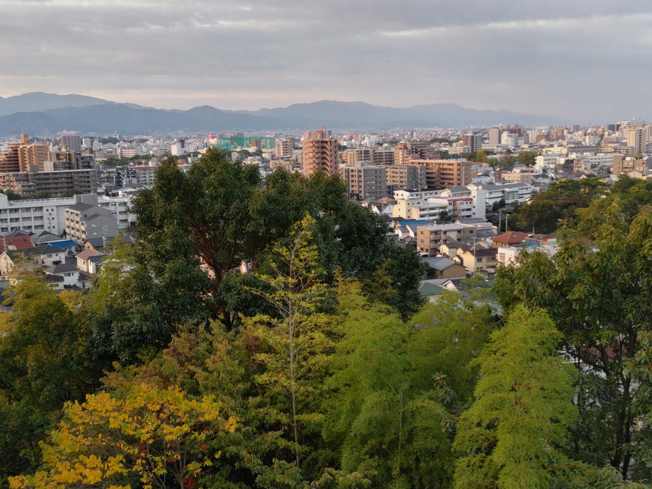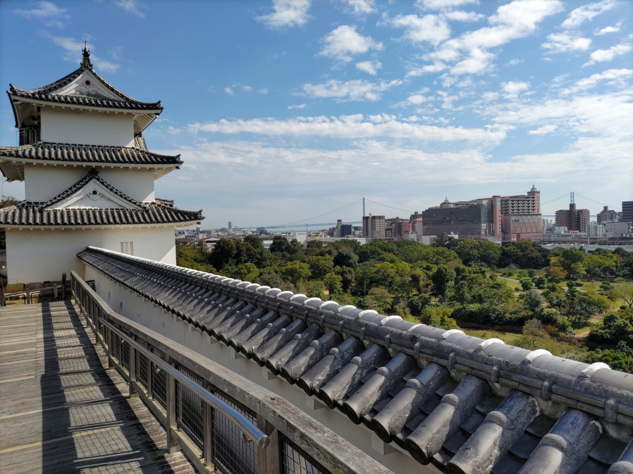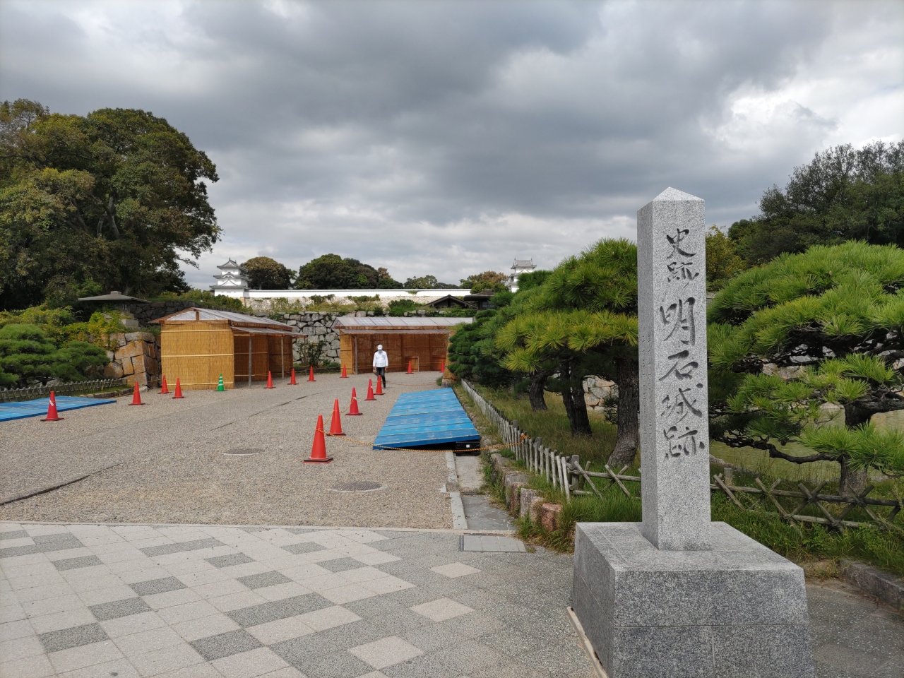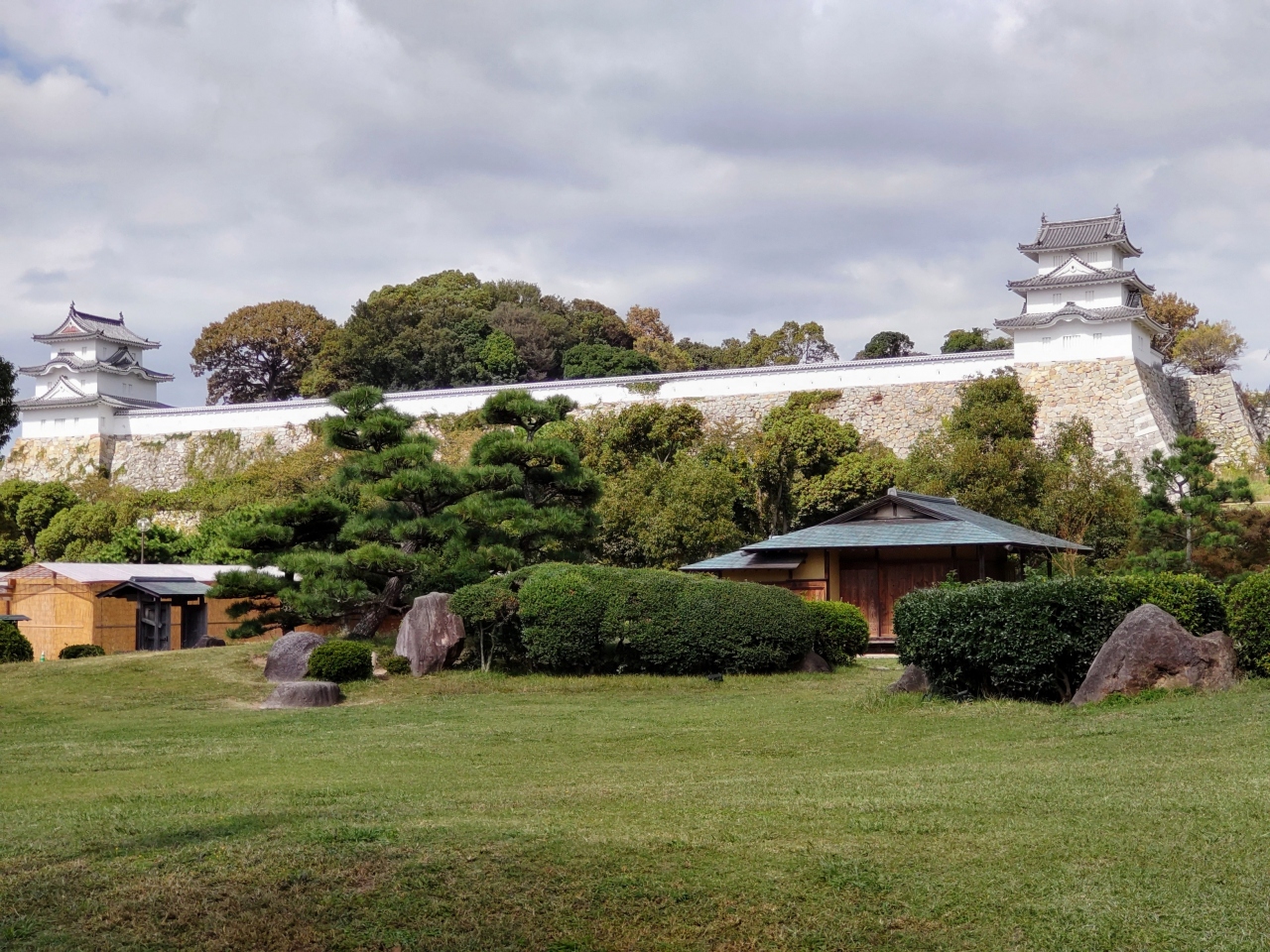 JR明石駅の直ぐ北、54ヘクタールを超える広い敷地に、明石城址、明石公園が広がっている。国の重要文化財の本丸跡や二ノ丸、東ノ丸、石垣、堀、武蔵の庭園、芝生広場などがある。JRの電車から城址がよく見え、以前から訪れてみたいと思っていた。明石駅を出て、正面入口から公園に入ると直ぐ右にサービスセンター(公園管理事務所)がある。ここで公園のマップをもらって、秋の陽光と爽やか風を受けながら公園内を歩いた。観光客はほとんどいなくて、地元の親子連れや高齢者の多くが芝生広場でくつろいでいた。