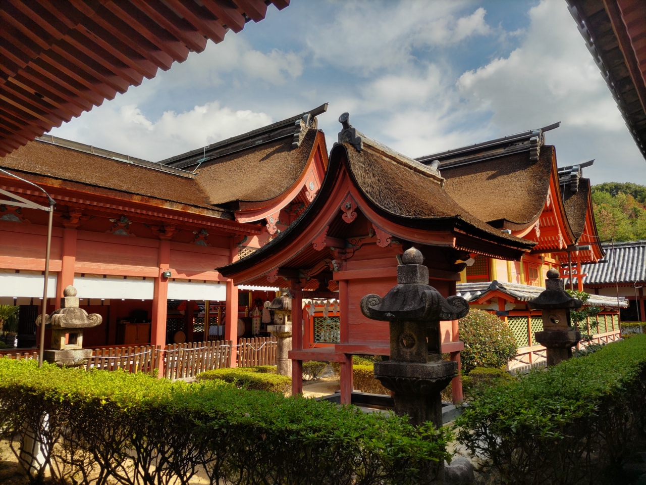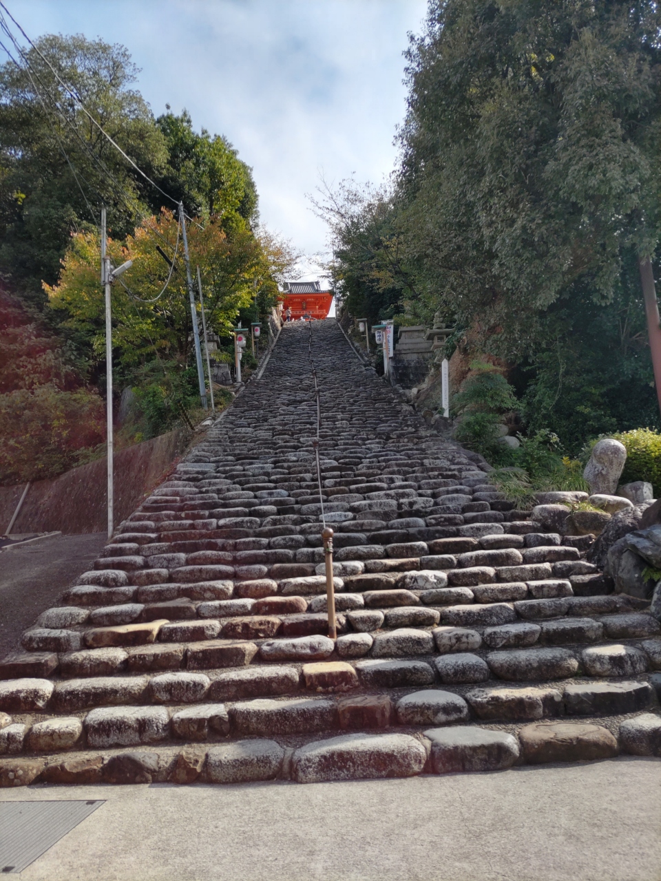 道後温泉駅前から真東に歩き、なだらかな伊佐爾波坂を登ると、神社の石段前に出る。まっすぐな長い石段を登ると、国の重要文化財に指定されている八幡造りの、朱色の華麗な社殿が見えてくる。総檜皮葺の本殿に回廊をめぐらせた現社殿は京都石清水八幡宮を模して建て替えられたものらしい。回廊の左奥に珍しい算額の写真が掲げてある(保護のため現物は保管)。伊佐爾波神社は、縁結びや心願成就のパワースポットとしても知られている。