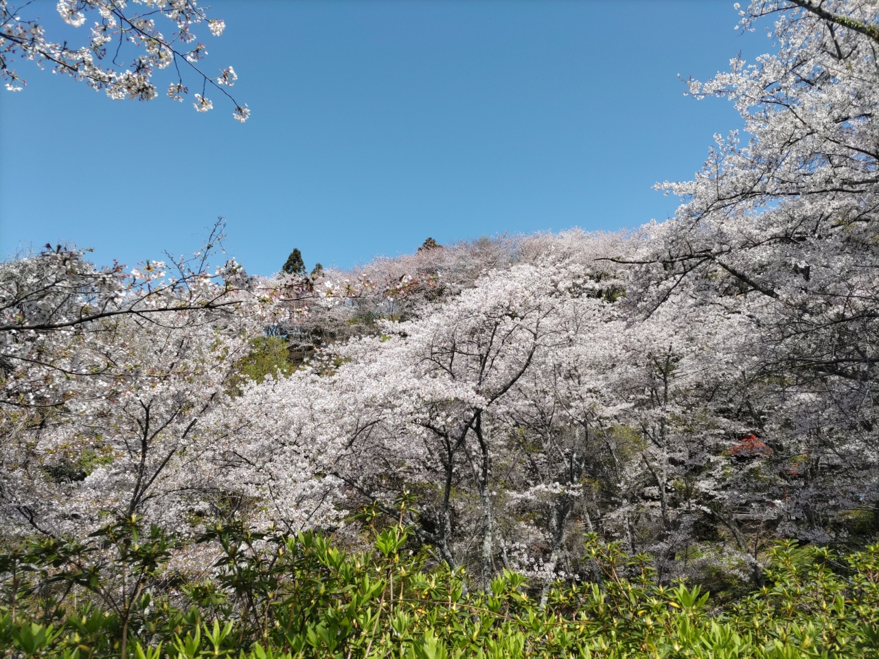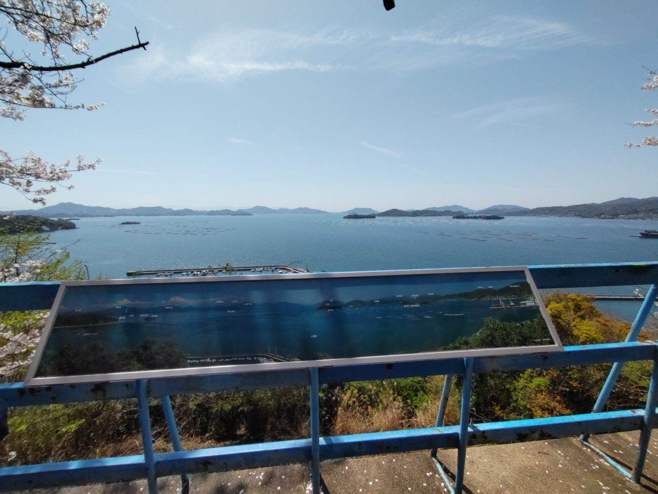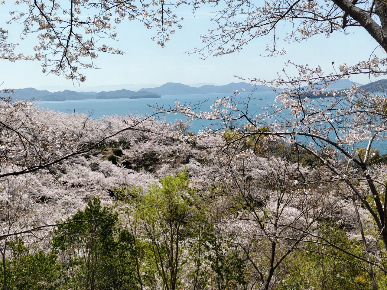 4月10日、50年ぶりに東広島市の正福寺山公園に花見に行った。1200本のソメイヨシノが咲き誇り、青い空と青い瀬戸の海に映えてとても綺麗だ。桜の木々の間から遠く四国山地も見える。素晴らしい景色だ!平日にもかかわらず多くの人が訪れ、ベンチに座ってビールを飲みながら弁当を広げている人もいる。いくつかの桜の木の前には、「結婚祝」「還暦祝」「誕生祝」‥など桜を植えた人の、日付とその理由も書いてあった。園内にはトイレも何箇所かあり、園の北側には数十台の駐車が可能な無料駐車場もある。