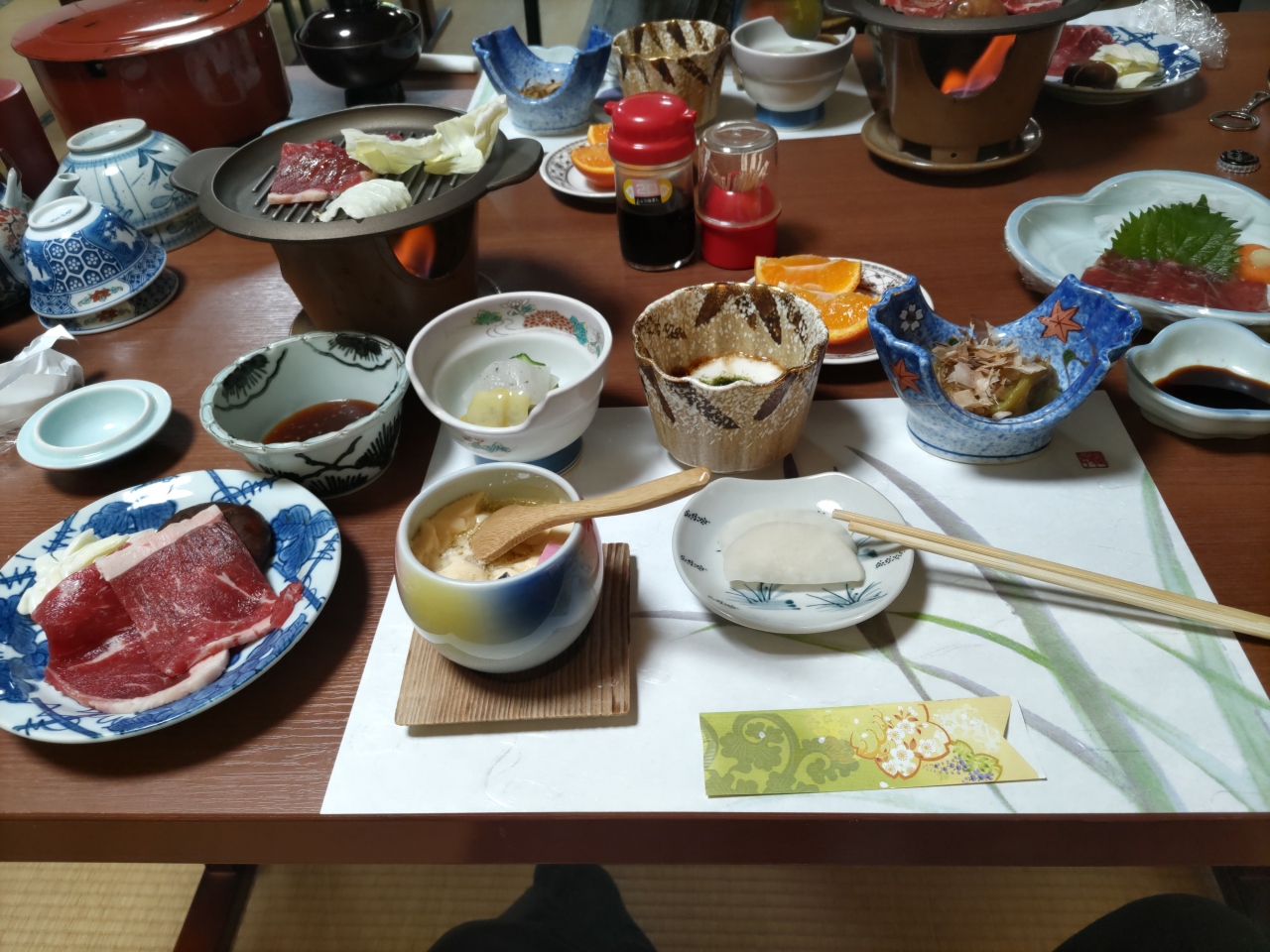 5年ぶり3度目の宿泊である。長者原から車で10数分、久住山登山口の牧ノ戸峠までも車で10数分の位置にある。筋湯の温泉街から少し外れている家族経営の2階建ての小さな宿である。宿泊料金が2食付きで税込み8000円、その上に瓶ビールまたは日本酒のサービスもある。源泉は90℃以上、かけ流しで泉質も大変良い。1階に家族風呂が2箇所。建物の直ぐ外に2箇所の露店風呂があり、旅館のサンダルで行ける。露天風呂はなかなか雰囲気が良く、奥側の方が広くてお薦めだ。