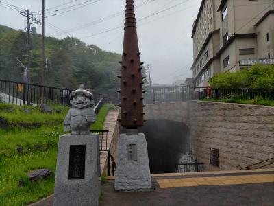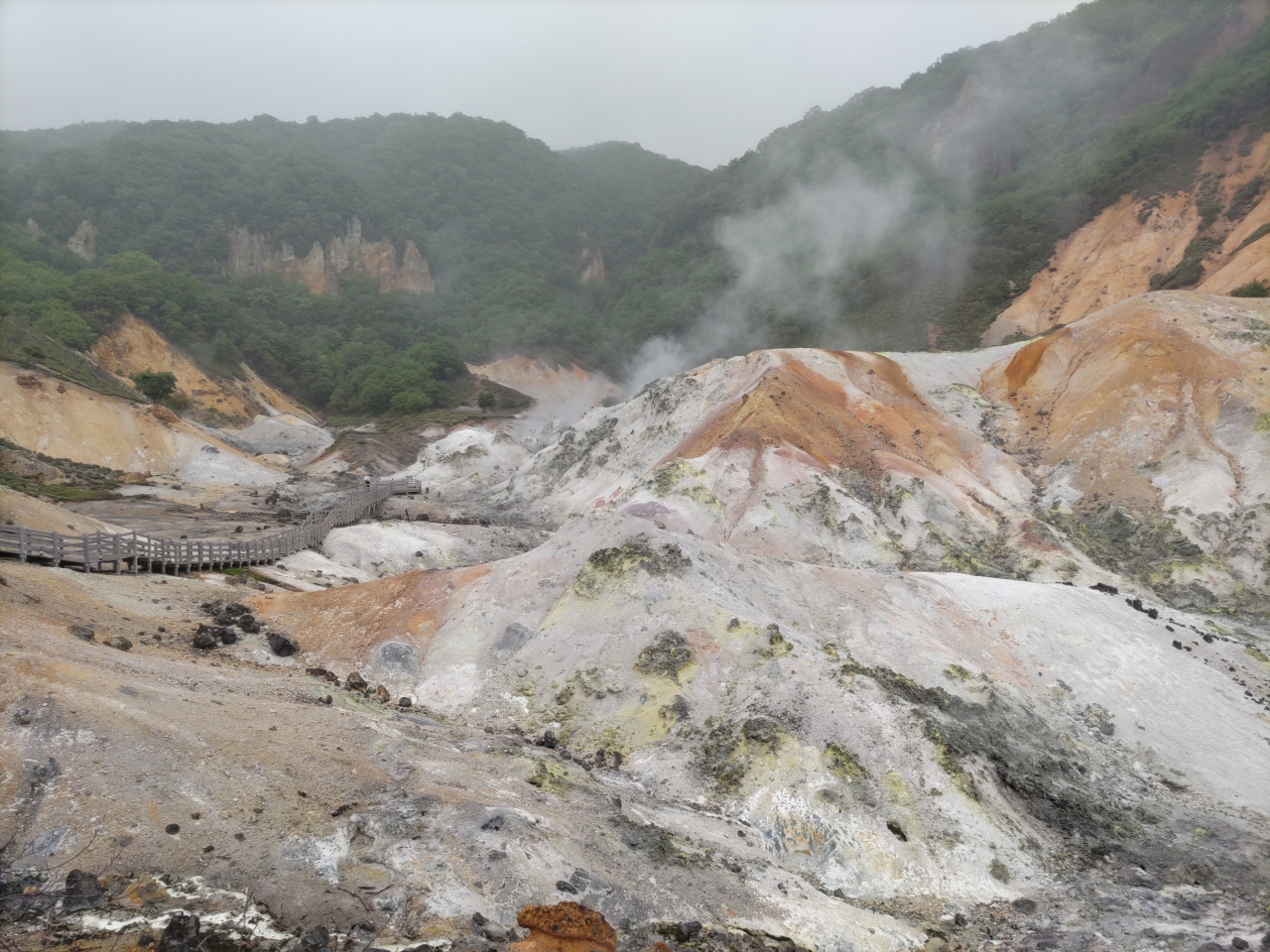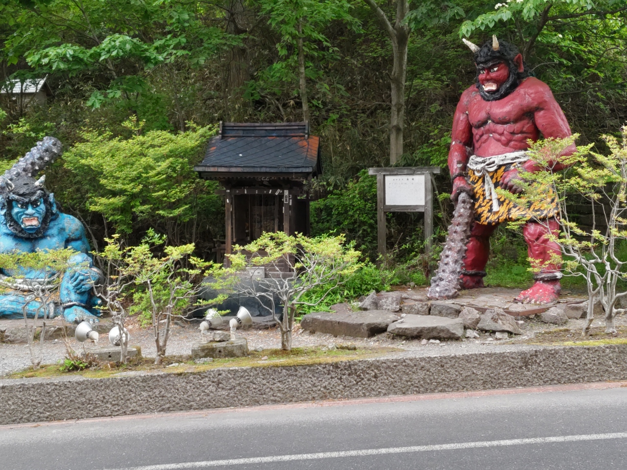 登別温泉バスターミナル付近から緩い坂道が、地獄谷付近まで約1㎞続き、両脇には旅館や土産物店が並んでいる。登別万世閣を出て、最初に左側にある観光案内所に立ち寄りマップをもらって、200mあまり歩くと右側に閻魔堂、左に水蒸気がたちこめる泉源公園、さらに少し登ると二車線の車道と合流し左側に鬼祠の赤鬼・青鬼に会える。さらに約200mで地獄台に到着する。