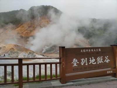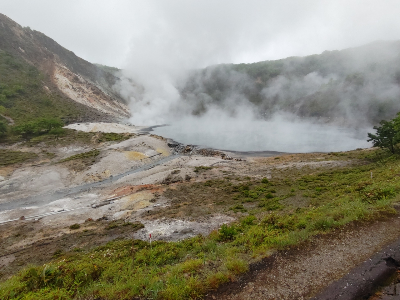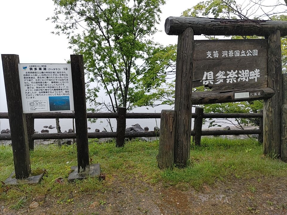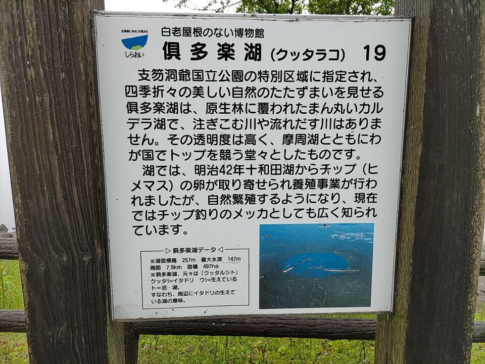 登別温泉から道道350号線を北に走り、右回りに車を走らせるとクッタラ湖畔に到着した。ここから30分ほどで、道央道登別東インターに戻ることができる。クッタラ湖は原生林に囲まれたまん丸い大きなカルデラ湖で、注ぎ込む川や流れだす川はなく、透明度は全国トップクラスらしい。残念ながら濃霧のため湖面を見ることができず、美しい景色を想像しながら案内板をカメラにおさめた。次のチャンスを着たいしたい。