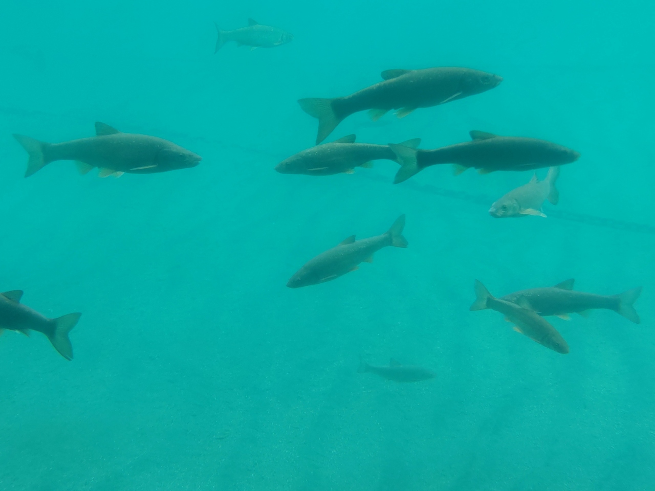 - 湖のコバルトブルー、淡水魚、柱状節理の岩石片が見える。
