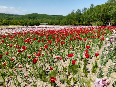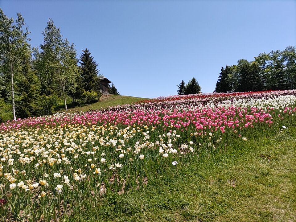 新千歳空港からレンタカーで国道36号線、道道341号線を走しり、1時間あまりで丘陵公園に到着しました。丘陵口のゲートで駐車料金420円を支払い、東口の前の駐車場に車を停めて、ここで入園料(大人450円、シニア210円)を支払って園内に入りました。広大な公園なので「中心ゾーン」だけを歩くことにしました。ややピークを過ぎていましたがカントリーガーデンは一面がチューリップで、青空とのコントラストがとても綺麗でした。ここから、こどもの谷に向かう途中スズランの甘い香りが漂ってきました。車で空港から札幌に向かわれる方は、是非立ち寄ってみてください。