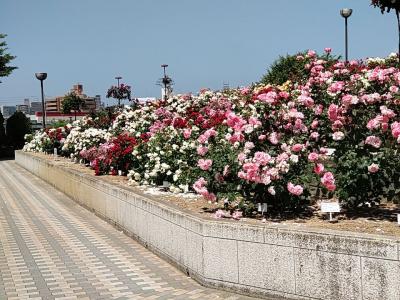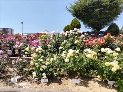 2022年度福山ばら祭りは5月14日・15日に福山市のバラ公園と緑町公園を会場に開催されましたが参加することができず、27日に福山に訪れ緑町公園のバラを見に行きました。祭りは終わっているので人影はまばらで、いくつかの品種は開花のピークを過ぎていましたが、まだ多くの品種のバラが綺麗に咲いていました。緑町公園の直ぐ南西に有料駐車場がありますが、その直ぐ南にスーパー「エブリイ」があり、その広い駐車場に車を停め、「エブリイ」で弁当を購入して公園を訪れました。