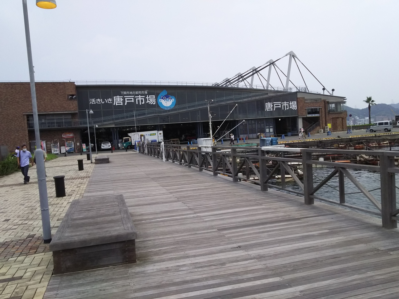 広島から小倉へのドライブの途中に、下関で高速を降りて唐戸市場で昼食をとりました。魚介類を売る小さな店がひしめき、呼び込みの声が響き、独特の雰囲気です。店の前の椅子に座り、そこで買った握り寿司を食べましたが、大変美味しかったです。唐戸市場の西に隣接するカモンワーフでも食事はできますが、店によっては若干市場の方が安いと思います。特に3時頃になると、安くして売っています。駐車場は市場の東側に隣接しています。