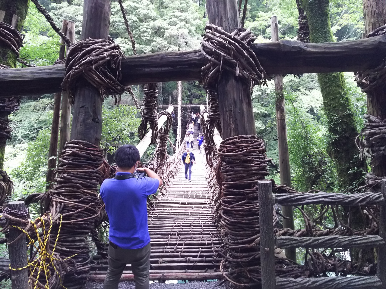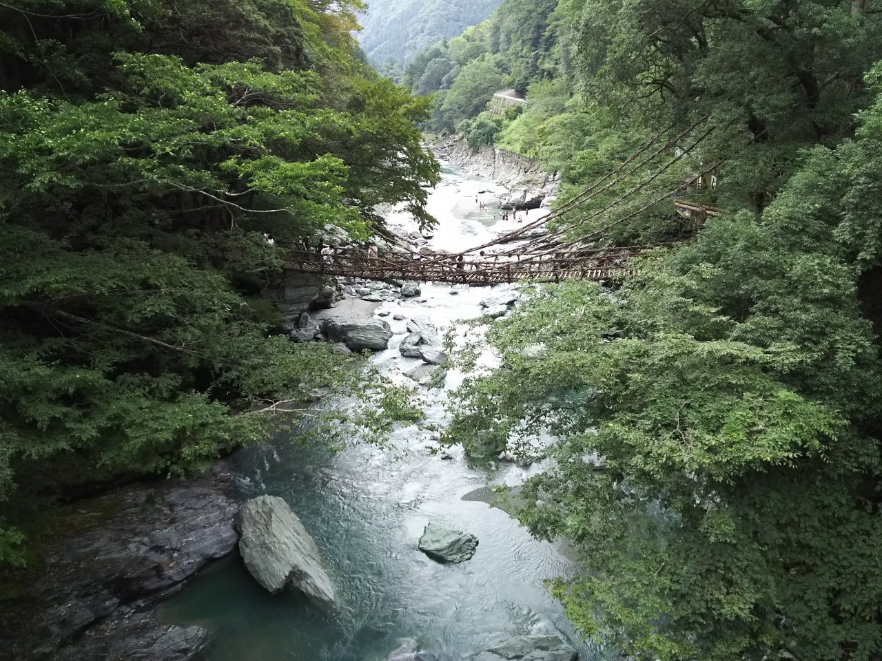 国道32号線大歩危付近から祖谷川沿いに東進すると、かずら橋の駐車場と売店(トイレや食堂を併設)に着く。ここから歩いて数分ほど下ると日本三大奇橋のかずら橋に着く。かずらで造られた長さ45m、高さ14mの橋で、一歩踏み出すたびにゆらゆらと揺れる橋はスリル満点だ。怖いと思う人は、前方を見て足の下の渓流を見ないことだが、それではあまり面白くない。橋の南側のやや東に滝があり、その近くから河原に降りることもできる。ここでから見る橋もなかなかいい。なお、渡橋は有料です。