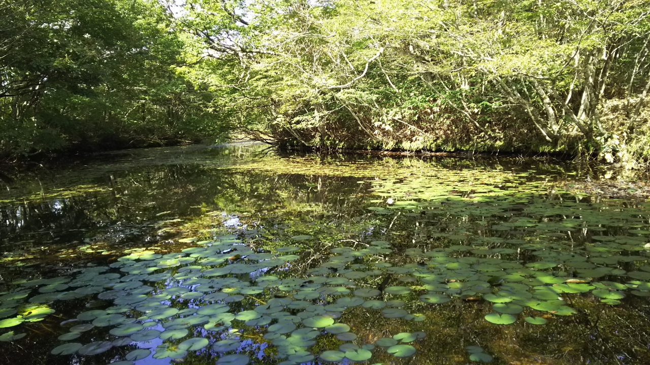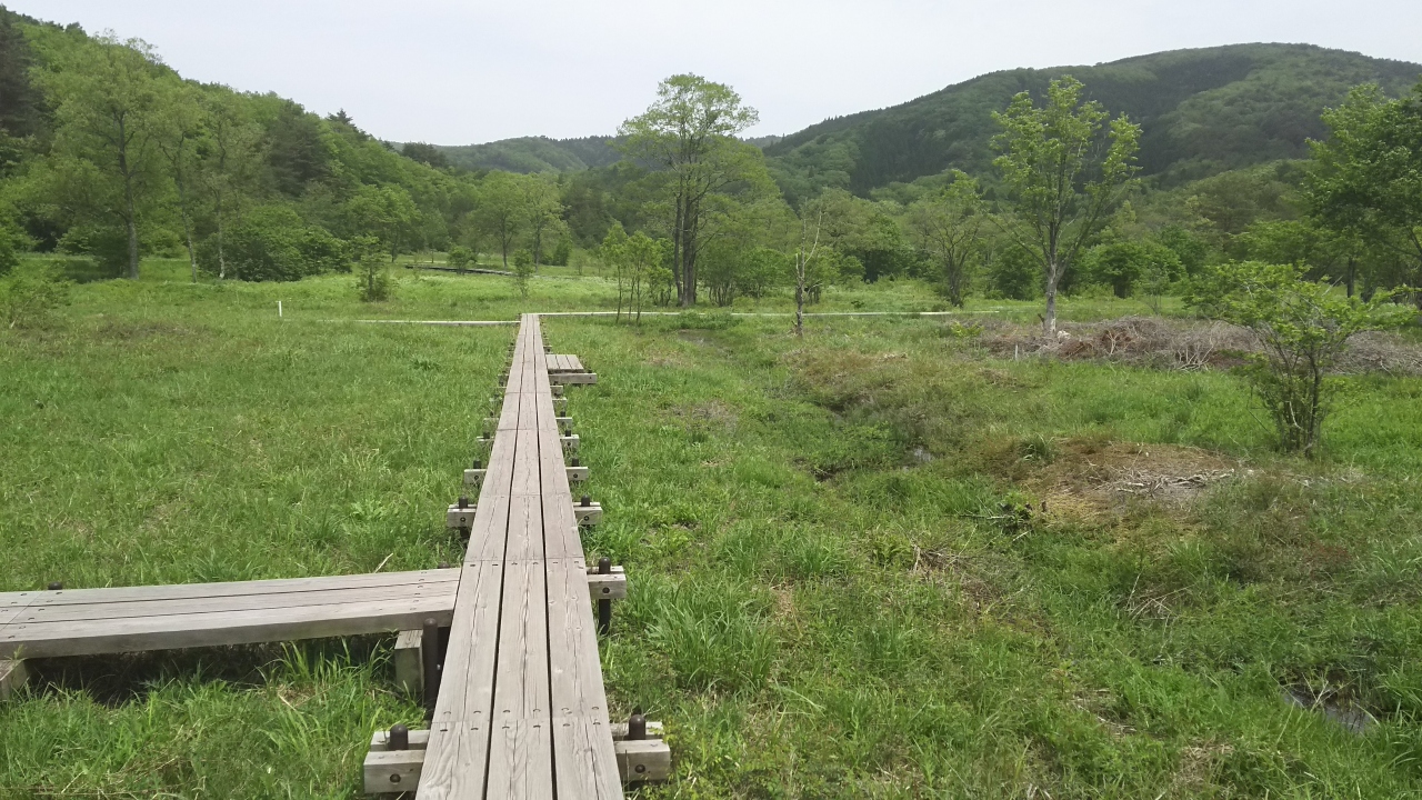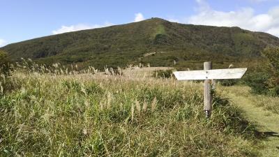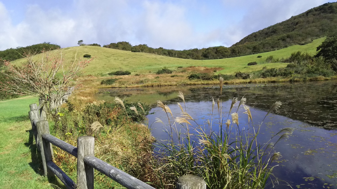 茅葺の建物や食堂、野菜売り場などが隣接する高原の自然館前の駐車場から、東に掛頭山登山口に向かって、車道を右側に掛頭山などを見ながら20分ほど歩くと、再生された湿原「霧ケ谷湿原」の説明版がある。ここから湿原の中を木道が西に続いている。「尾瀬」歩きを思い出す風景だ。15分ほど山野草や小鳥の声を聴きながら木道を歩く。車道に出るところで少し左に折れると、林の中を遊歩道が続いている。途中湿原があり木道が続いているが、左の大きい木道を進むとやがて展望が開けて、草原が広がり、正面に八幡高原191スキー場が見える。草原の中を千町原まで歩いて東に高原の自然館まで歩く。約1時間30分ほど高原を歩く、気持ちの良いコースだ。