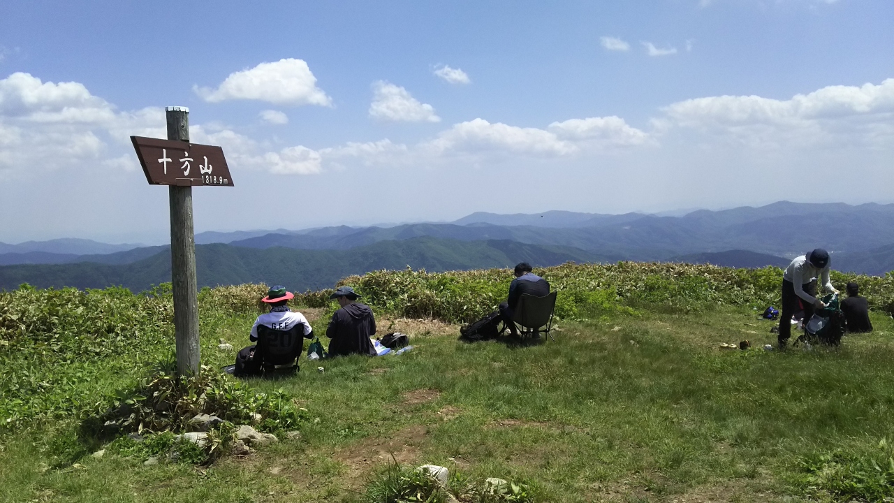 十方山への登山道はガイドブックにいくつか載っており、南の立岩ダムからのコースが一般的だが、片道2時間半~3時間を要する。恐羅漢スキー場の二軒小屋駐車場に車をおいて40分ほど歩いて、水越峠近くの獅子ケ谷登山口から沢道を1時間あまり登るコースも何度か登ったが、石がゴロゴロした道で歩きにくい。知人の紹介で獅子ケ谷登山口から近年開発された尾根道を登るコースを試してみた。急登だが歩きやすく、約1時間で三角点(展望は良くない)を経由し頂上の笹原についた。頂上は笹原、展望抜群だ。
