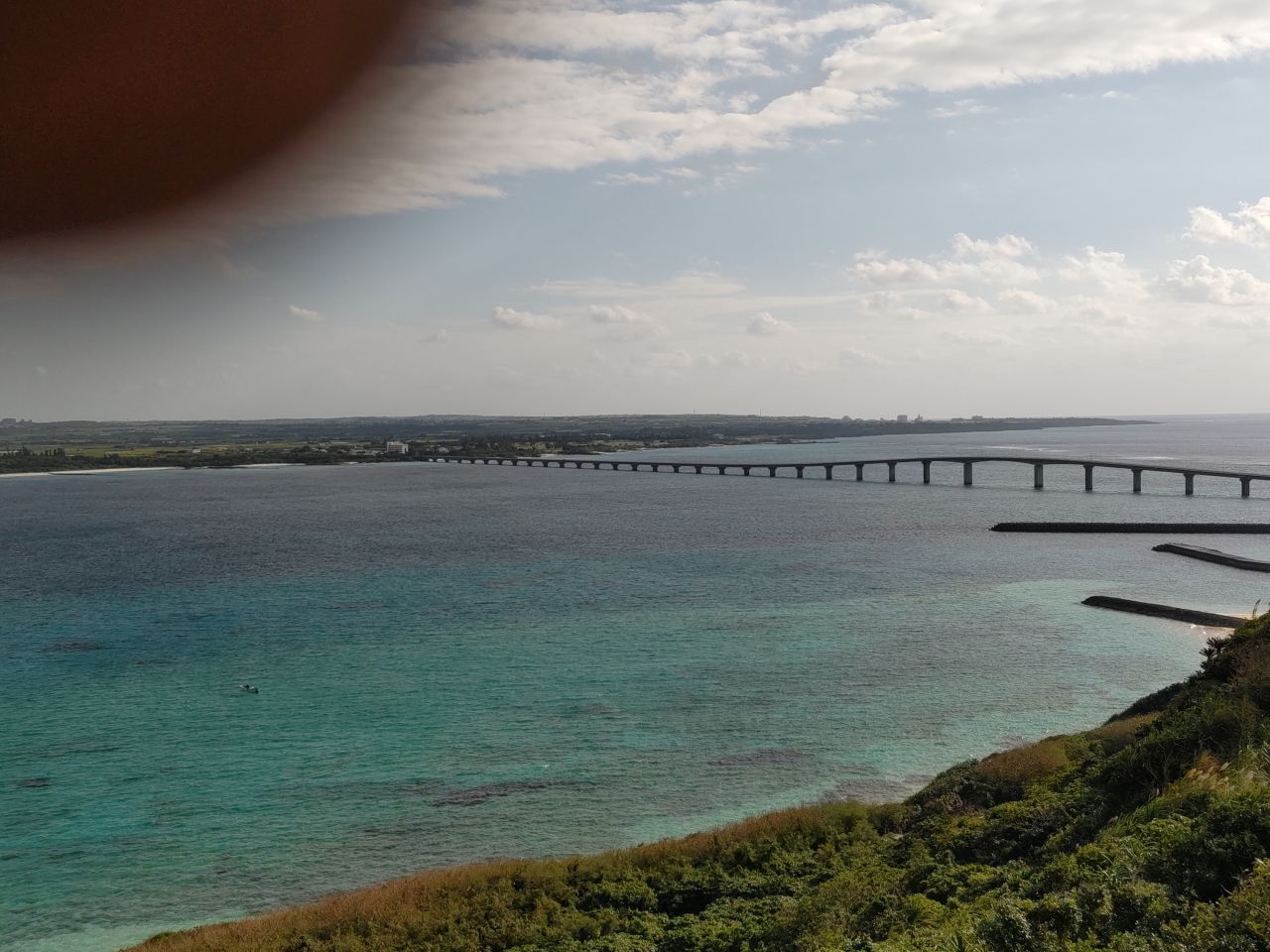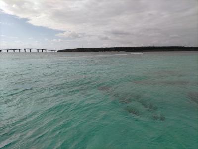 宮古空港から左回りに宮古島をドライブし池間大橋に着いた。宮古島と池間島を結ぶ長い橋で、橋の両たもとから一望できる。池間島側のたもとの駐車場にはトイレと数件の売店があり、砂浜まで降りることができる。砂浜には、海底火山活動による小さな軽石が20~30cmの帯状に打ち寄せられていたが、海水の上には浮いていなかった。宮古島側にも駐車場があり、ここからの眺めは最高である。青い海とサンゴ礁‥‥本当に素晴らしい!