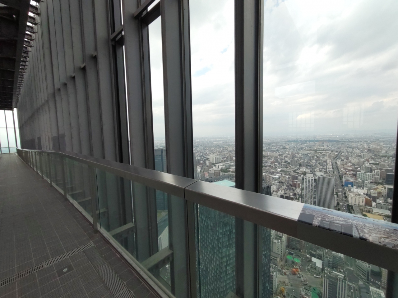 名鉄名古屋駅前の通りを東に渡ると(JR名古屋駅から地下道もある)、高さ247mの名古屋一の高層ビルミッドランドスクエアがある。このビルの44~46階はスカイプロムナード、回遊型の展望デッキになっていて、名古屋市街地をほぼ360°見渡すことができる。眼下に大都会名古屋のビル群、名古屋城、ナゴヤドームなどが見え素晴らしい絶景だ。回遊しながら、コーヒーを飲みながらくつろぐこともできる。入場料は大人1000円だが、シニア割引があり500円だった。