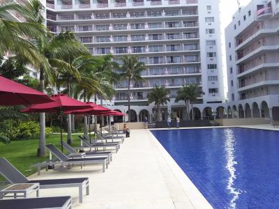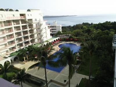 名護から海を左に見ながら車を走らせ、海洋博公園手前数キロのところの道を右に登ると、丘のうえに綺麗なホテルがあり、その向こうに広い無料駐車場があります。フロントをはじめスタッフの対応は、いずれも笑顔、親切、丁寧で好感が持てます。3つの宿泊棟囲まれた中庭には、ヤシの木に囲まれたプール、客室にはハワイのホテルにあるようなラナイが設置されており、ここの椅子に座ると海とプールが眼の前に見え、南国ムード満点です。食事も大変美味しく、大浴場もあり快適に過ごすことができました。