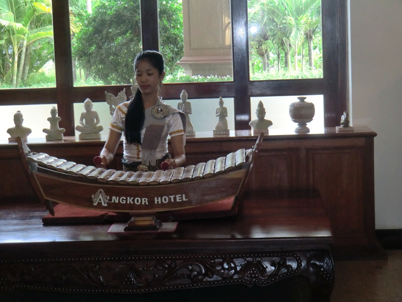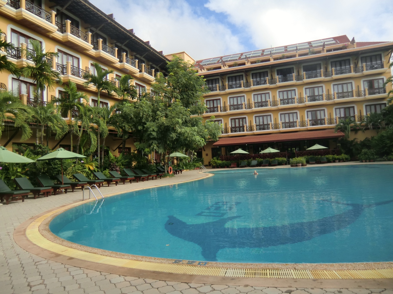アンコールワット観光の際に3泊しました。フロントロビーでは若い女性が民族楽器の演奏をしていました。部屋は比較的広くて、全室バルコニーがあり、よく清掃されていました。内庭に比較的広いプールがあり、いつも何人かが水泳を楽しんでいました。レストランの朝食は大変美味しかったです。スタッフは、レストランの方をはじめ皆笑顔で爽やかで、4日間快適に過ごすことができました。フロントの方は、対応が悪いという訳ではありませんが、もう少し笑顔があればもっと良いと思います。ホテルを出て右に10数m歩くと右側に、安くてメニューの豊富な日本食堂があります。