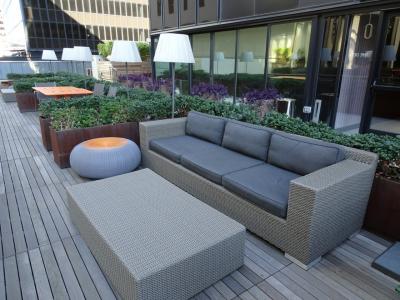 部屋には、外に出られるベランダがあり、テーブルとイスが置かれているので、まったり食事をしたりできます。リフォーム済みのホテルで、全てが新しく気持ち良く過ごせます。3階には中庭があり、ソファが置いてあるので、ダウンタウン中心部にありながらリゾート地のような雰囲気もあり、とてもオススメです。