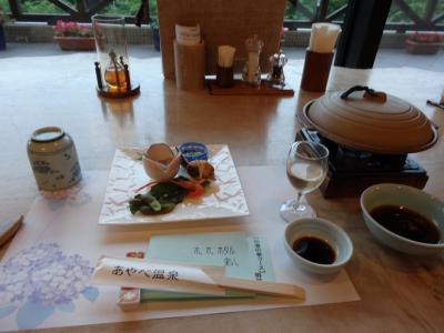 夜は露天風呂に大きな茶碗のお風呂と木のお風呂があり茶碗のお風呂は熱め