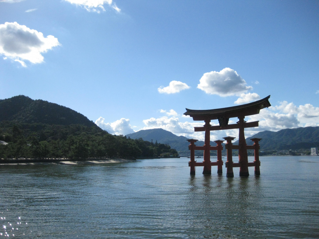 JR西日本フェリーから見える赤鳥居は小さく見えますが、実際に厳島神社から見える赤鳥居は想像以上に大きい。干潮と満潮の中間の時間帯なので、徐々に潮が上がってきます。観光客の一人が大鳥居に向かって、すねまで浸かりながら歩いていくのにはびっくり!参道の両脇には食事処やお土産屋などが軒を並べる。平日にもかかわらず観光客が多い。訪れたこの日は修学旅行中の高校生が多かったです。55年前の修学旅行で宮島を訪れたことが懐かしい。