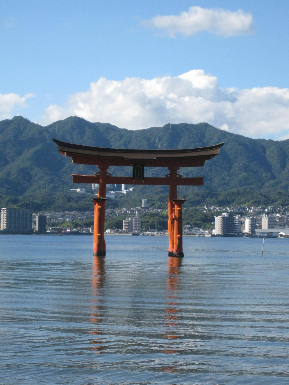 秋の乗り放題パスでフェリーに無料で乗船。ただし、宮島の訪問税(100円)が別途必要。宮島に渡るフェリーは車が一台も乗っていない。カモメがフェリーの後ろを追いかけて来ない。餌のかっぱえびせんをあげることがないらしい。船内から見える山陽側と宮島の景色両方とも一望できるのがいい。他社のフェリーや、宮島から来るフェリーが行き交う景色もこれまた絵になるほど素晴らしい。赤い大鳥居が右手奥に見え始めると、下船が間もない。15分間隔で一時間に4本あるというのも便利。10分ほどの船旅も新鮮さがあって楽しくなります。