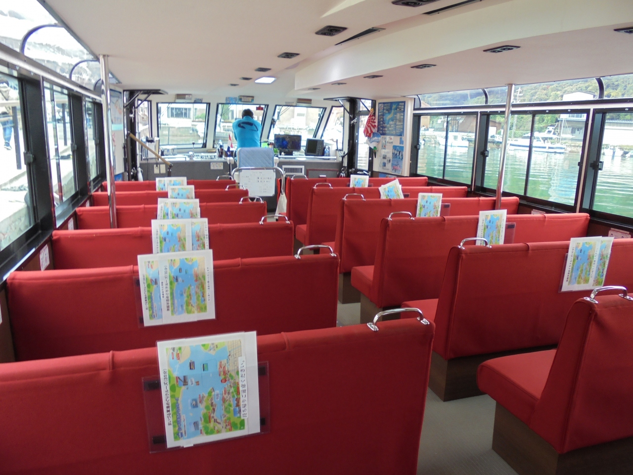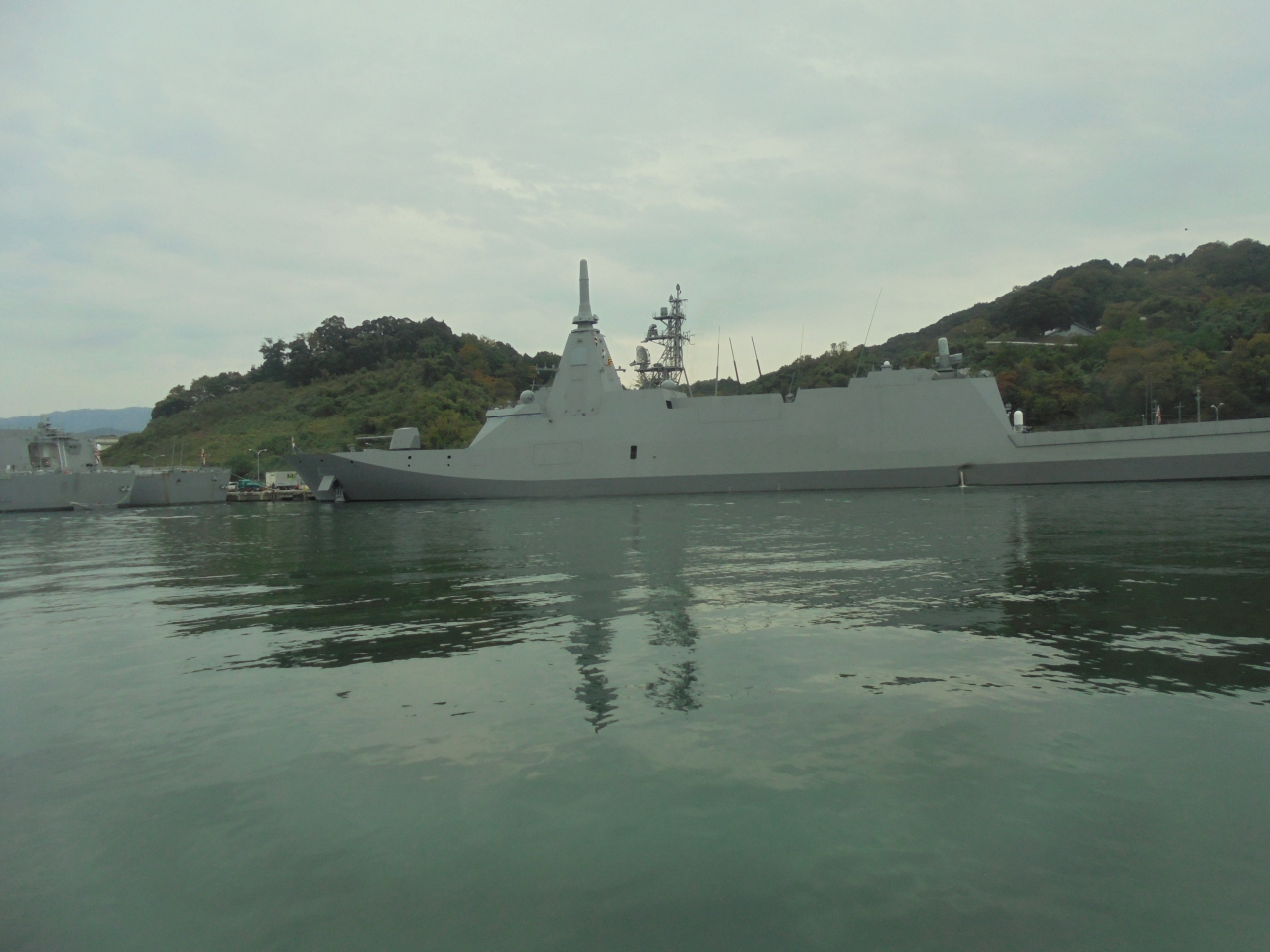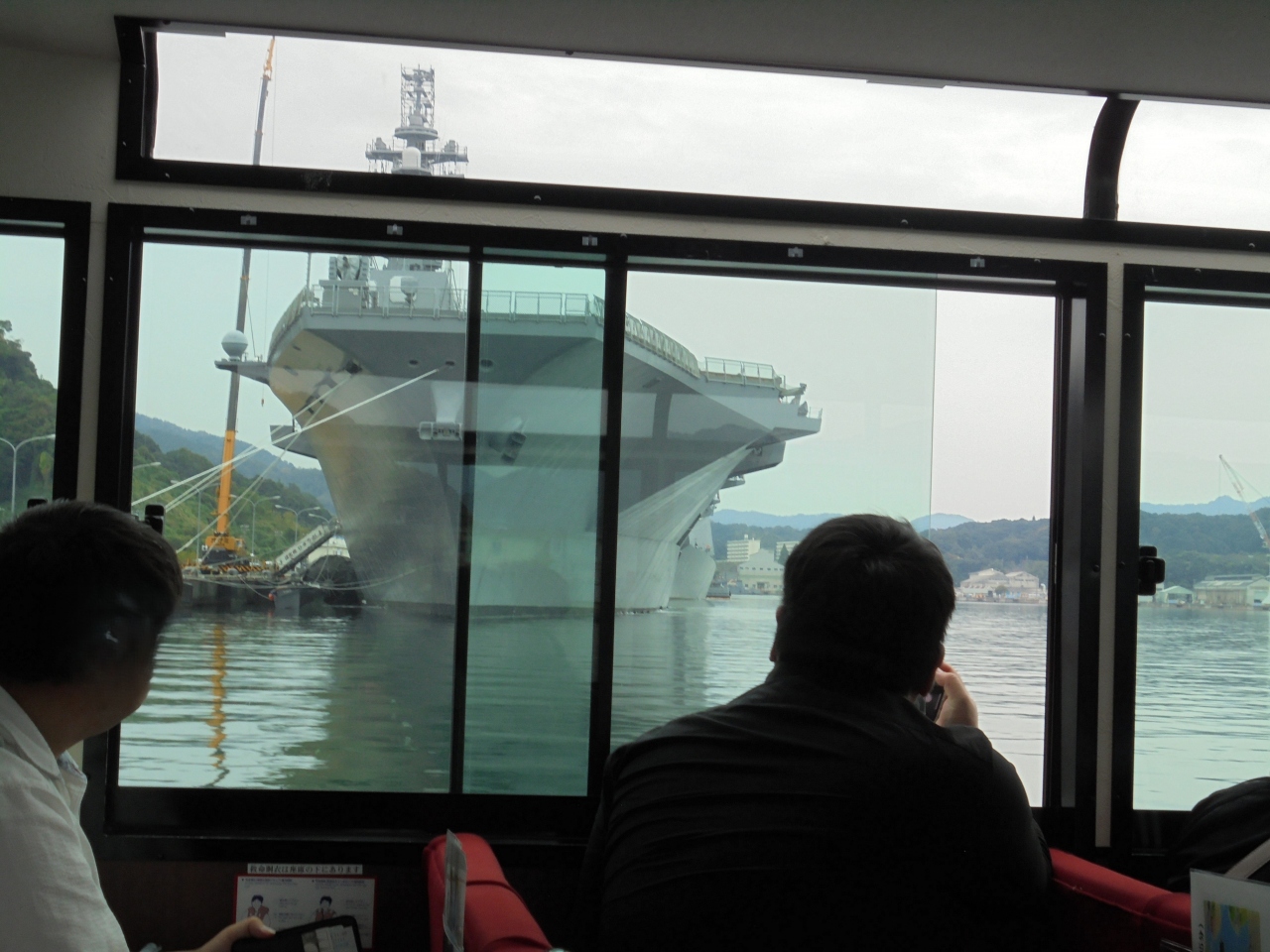 午前11時出航の船に乗船。乗船料1500円で35分間のクルーズを楽しみました。曇り空でしたが、波風が穏やか。船内ではスタッフさんの紹介から始まり、クルーズの案内、救命胴衣の説明もあって安心できます。船内放送のアナウンスもありますが、専属スタッフさんの説明ガイドもプラスされていて、まったく飽きることはありません。停泊している自衛艦にはそれぞれ特徴があり、わかりやすい説明にはユーモアもあって満足できました。