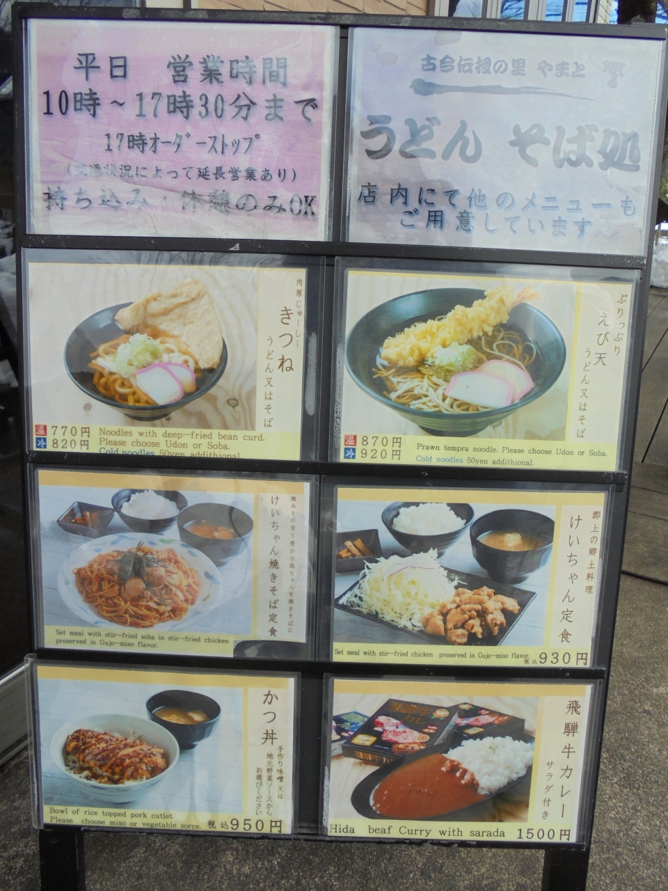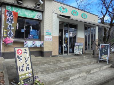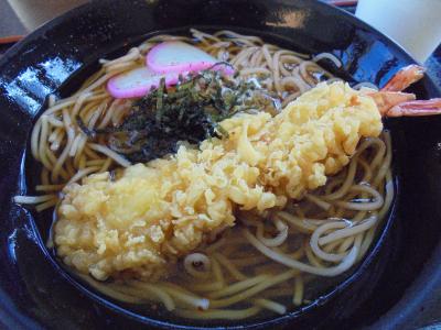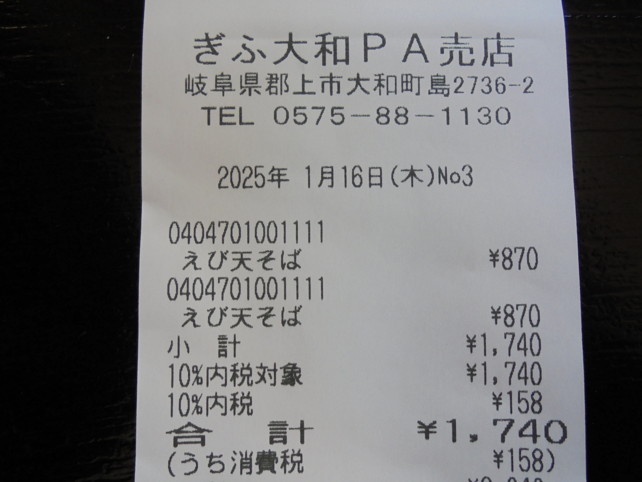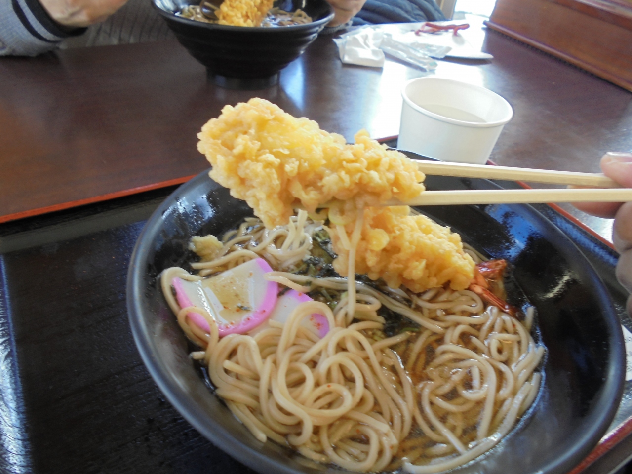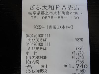ぎふ大和PAの右端にある食事処「やたい屋」を利用しました。朝食をお腹いっぱいに食べていたので、昼食は軽く済ますために立ち寄り。厨房前でオーダーしてテーブル席へ。窓が大きくとってあるので、田園風景が見えてのんびりとした感じがします。海老天そばは、大きな海老天が一本そばの上に乗っかっている。一味や七味の唐辛子をかけて、いただきます。中細のそばはそば殻も入ったグレーな色。のど越しも良く、スープとの絡みもいい。カリッと上がった海老天もいい味。特に、スープの味が際立って美味しい。きれいに飲み干してしまいました。