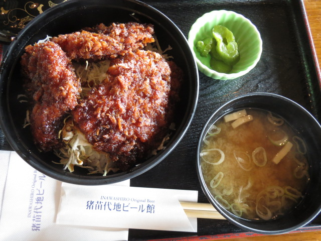 おかし館のすぐ隣にあって、こちらもレンガ造りになっています。 一階のエスカレーターから見えるステンレス製の熟成タンクや、二階のポットスティル風の大きな銅製の釜が二つ並んで見えるのも素晴らしい。二階のレストランで食事するのがおススメ。ご当地名物のソースカツ丼・味噌汁小鉢付き。適度な歯ごたえのあるジューシーなジャンボカツ3枚をのせ、ソース味のカツにキャベツとご飯がよく合う。家内は猪苗代地ビール5種類(国際ビール大賞を受賞)お楽しみセットとチーズソーセージ盛り合わせをオーダー。ビールとソーセージがよく合っていて美味しかったとのこと。