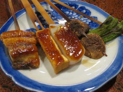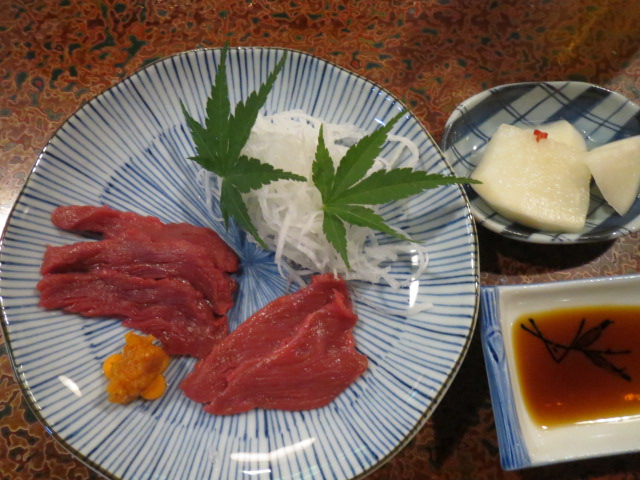 白い壁の大きな蔵の中にあるお店。テーブル席もあるが、予約になっていました。座敷でいろいろなメニューをオーダー。料理が出るまでに、蔵の中にあるうるし美術館をぜひ見学してほしい。喜多方漆器をメインに多種多様な品が所狭しと展示されています。オーダーした馬刺しはクセがなく柔らかい馬肉。九州では馬刺しがよく出るが、会津地方でもメニューにあるとは驚き。自家製のあま味噌・山椒みそで焼かれた六種の田楽セットも素朴な味わいで美味しい。