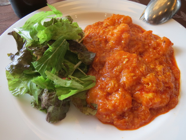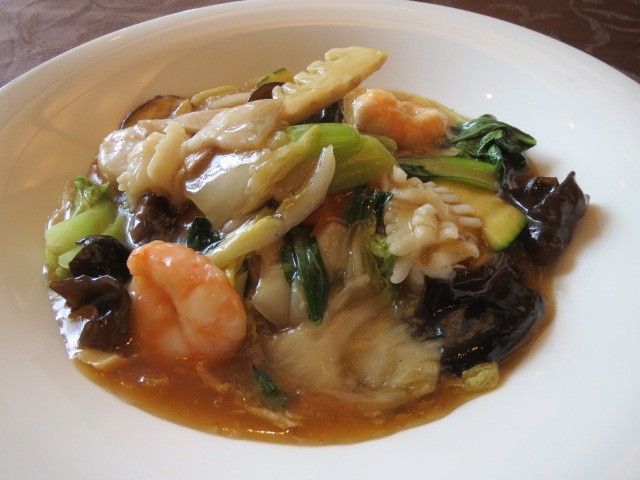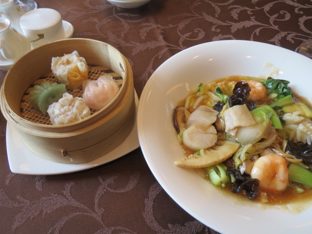 平日のランチ時でも外で並ぶことが多い、人気の高級中華料理店です。家内と一緒に入店。店内はサックスとピアノの静かなBGMが流れて静かな雰囲気です。テーブル席が3つある小部屋で飲茶セットを。セット内容は4種の飲茶、麺類・飯類から五目あんかけ焼きそば、杏仁豆腐。他にエビチリと空芯菜炒め、ノンアルコールもオーダー。海鮮などの具材がたっぷり入った飲茶、海鮮・野菜がたっぷりの焼きそば、どれも美味しい。ピリッと後味のするエビチリ、きくらげも入った空心菜炒めも、ともに具材の持ち味を大切にした調理で最高の味わいでした。