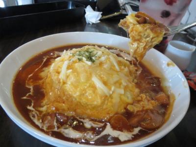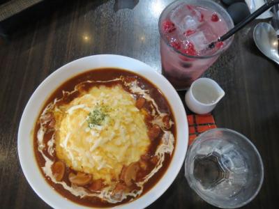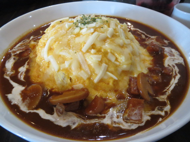 夏休み最初の日、しかも土曜日なので店内は大混雑。15分ほど待ってテーブル席へ。店内は落ち着いた雰囲気、話好きのお客さんもいるが、それほど気にならない。ベリーベリーソーダとチーズオムライスデミソースをオーダー。オムライスの味を一層高め、コクのあるデミグラスソースがたっぷりかかったオムライスは、ふわふわ卵で上手にくるまれている。チーズもオムライスの上にかかっていて、チーズの香りがいっぱい。ベリーのほろ苦さがソーダとマッチ