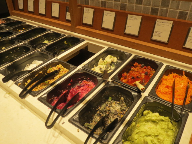 タワーズ13階にある、食べ放題のレストラン。ランチ時は平日でも並ぶ人気店。訪れたこの日は台風が近づいているためか、お客さんは半分程度。店内は意外と広く温もりが感じられる。店員さんは丁寧親切に接客してくれるので、初めてでも安心できます。メニューはひとつだけ。時間制限90分で税込¥2500。器はほとんどが木製、好みで選べるのがいい。野菜をメインにした手作りの料理が所狭しと並んでいる。野菜サラダはもちろん、パスタ類、煮物、天ぷら、カレー、5種のおにぎり、などなど。ドリンクは麦茶、緑茶など、特にコーヒーが美味しい。手作り感溢れるヘルシーな料理が多いのがこのお店の特徴です。