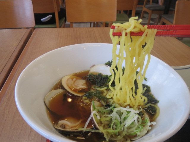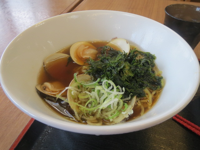 関西方面へ行く際には、下り線のお店でよく食べる蛤ラーメンを、今回は上り線で初めて実食。食べてみたのは、蛤あおさ醤油ラーメン¥1100税込み。お値段は少々高め、大振りの蛤が三個入っている。数年前に下り線で食べた蛤ラーメンには五個入っていたはず。物価高はここにも波及している。メニューの名前の通り、あおさはたっぷり。ラーメンには欠かせない刻み葱もいいアクセントに。醤油ベースのスープはやや少なめ。麺は細めのちぢれ麺。蛤は貝の旨味が凝縮されて口の中に磯の風味が広がる。麺・スープとの相性も抜群。蛤の数が少なかったものの、蛤の味は最高。満足できるラーメンでした。