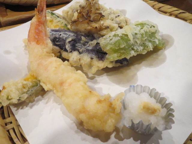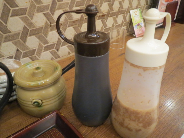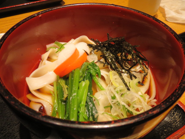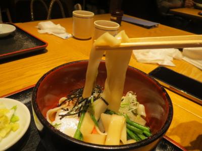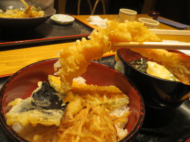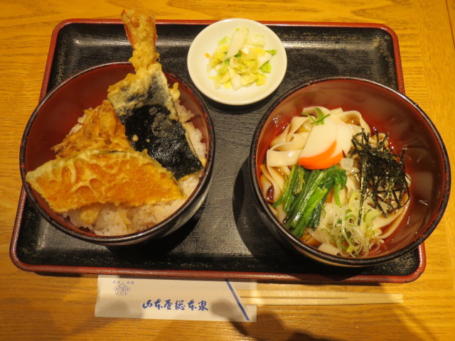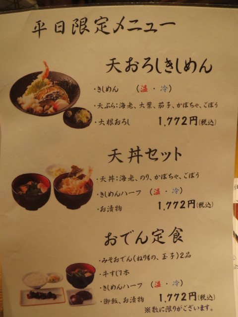 松坂屋名古屋本店9階にあるレストランです。こじんまりとした店内は2人・4人がけのテーブル席、中央に向かい合せのカウンター席が8席。落ち着いて食事が愉しめそうな雰囲気。オーダーしたのは平日限定メニューの天丼セット(天丼ときしめんハーフ冷)。家内は天おろしきしめん。お好みでかける唐辛子はスタッフさんに申し出。一味と七味の二種類あるから、これもお好みでチョイス。もちもちしてコシが強いきしめんは歯応えのある固さ。スープはやや辛めだが、幅広のきしめんとの相性が抜群で満足できる美味しさ。天丼のお米はやや固め、一粒一粒がしっから感じられる。ご飯にかかったタレはやや甘め。天ぷらはサクサクした食感。甘めのタレとお米、天ぷらとのマッチングは最高レベルに達している。値段はやや高めだが、味がお値段以上で満足できる天丼セットでした。