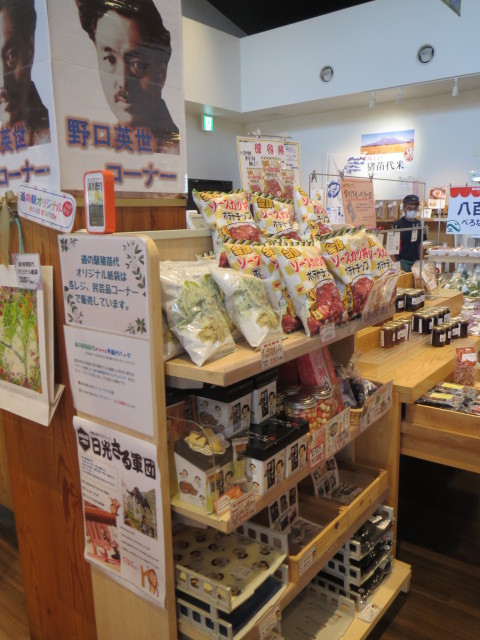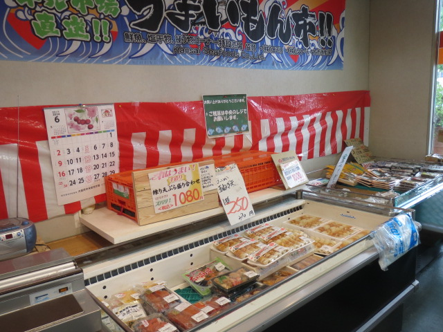 地元で生産されているタケノコや大根、小松菜などの野菜、この時期特産の美味しそうなビワが所狭しと並んでいます。もちろん、加工品の種類も多く、ミニスーパーのよう。野菜・果物などの生産者の紹介を写真付きで壁に掲示されているから、安心して買い物ができます。店内には券売機でオーダーできるレストランまであります。ランチメニューだけでなく、モーニングメニューまであるのが嬉しい。出入口あたりにお子様も喜びそうなカブトムシやクワガタムシも虫かごに入れて販売。産直市だけでなく食事もできる施設が充実している道の駅でした。