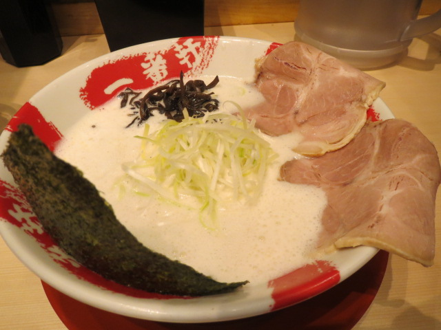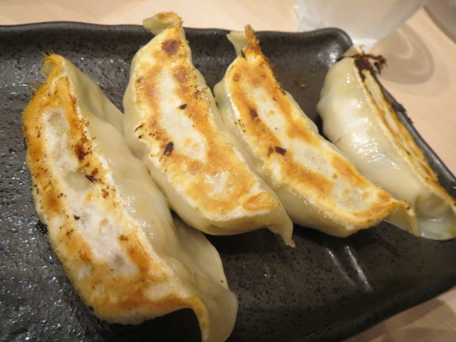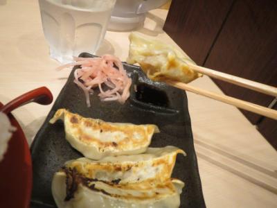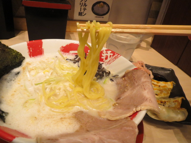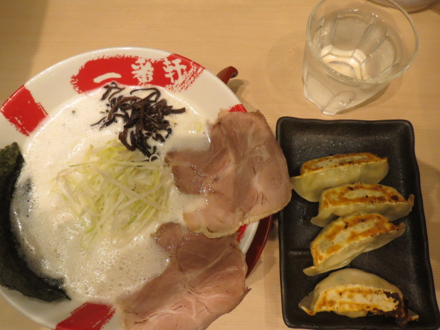大名古屋ビルヂングの地下一階、大名古屋ダイニングにある、ラーメンが人気のお店です。こじんまりとした店内には、厨房を囲むようにしてカウンター席があり、二人四人がけテーブルもある。オーダーしたのは餃子セット。白豚骨の中華麺とのセットメニュー。注文の際、麺の硬さやネギの種類が尋ねられる。普通の硬さと白ヒゲネギを選択。好みに合わせてラーメンがアレンジできるのはいいサービスだ。つるつるもちもち食感の多加水太麺、どちらかというと中太麺だ。白い豚骨スープが美味。4個の餃子は、野菜の具材がいっぱいでヘルシー。調味料の種類が多く、紅生姜が食べ放題なのもいい。