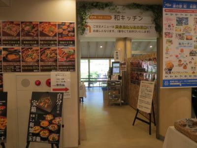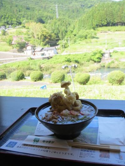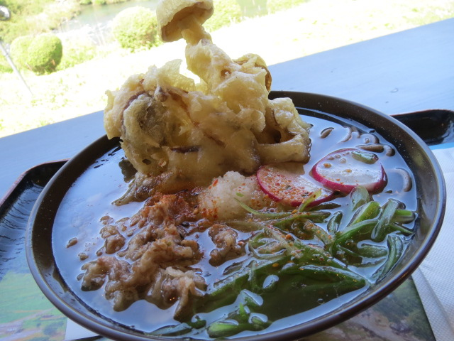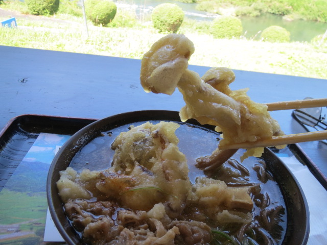 第二Pに屋根付きで無料充電設備5台分あり。当面の間は無料充電とのこと。施設前の駐車場は広くて停めやすい。お土産がかなり充実していて、選ぶのに迷うほど。ちょうどお腹が空いていたので、和なごみキッチンで食事。注文したのは、なごみそばデラックス ¥850 並盛。大盛りは\100増しだ。なごみそばには、大きなキノコの天ぷらがどっかり。結構ボリュームがある。大盛にしなくて良かった。中細麺と肉、出汁の味のバランスがとてもいい。ボリュームもある。島根県津和野で食べた「しこたまそば」とよく似た味わいだ。カウンター席からの眺めは、川と野山の里風景が見渡せる。里山の景色を眺めながら、美味しいそばを食べられて大満足でした。