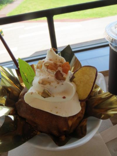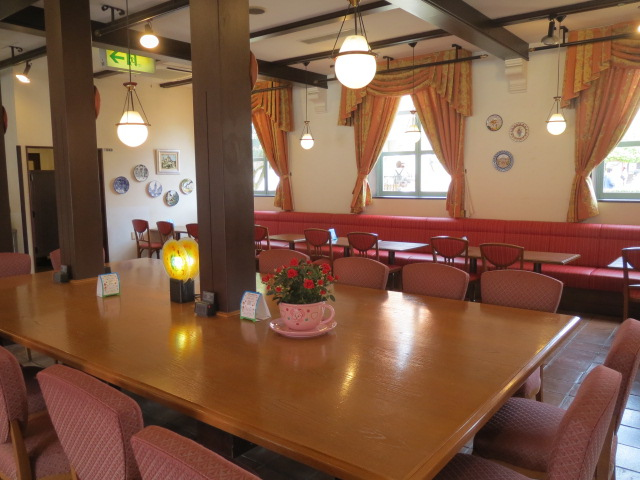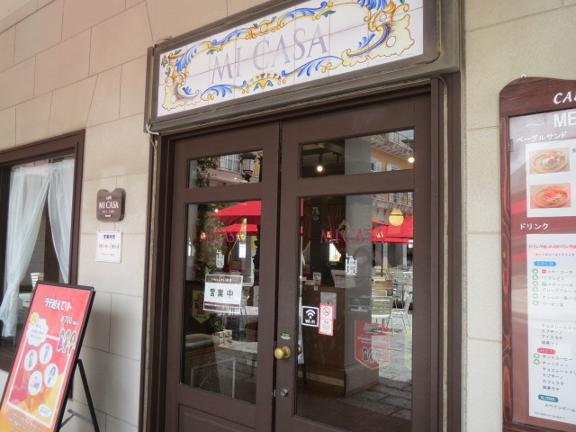 お昼からのパレードが店内からも見られるカフェです。この日もパレードの様子を撮影するために小休憩してみえるお客さんもいました。スペインのカフェをイメージした店内は、意外と広く窓側の席も十分なスペースがあります。生ハムベーグルとブレンドコーヒー。家内はアイスコーヒー。ベーグルには生ハムだけでなく野菜も挟まっていて、ベーグルのほのかな甘みと生ハムの旨味が調和して、実に美味しい。苦みが少し感じられるコーヒーは、香り・コクのバランスがよく、ベーグルとの相性もいい。軽食が終わる午後1時前、パレードのスタッフさんが窓の外から笑顔で挨拶してくれました。さあ、パレードを見に行こう。