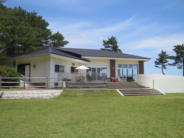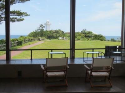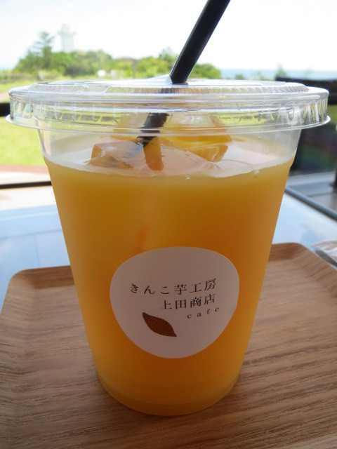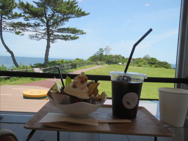 安乗埼灯台の北西方向にあり、緑の広大な芝生広場の傍らに立つカフェです。目立つようなお店の看板はまったくないので、うっかり通り過ぎてしまいそうです。入り口まで緩やかなスロープもあって車いす利用も安心。店内の大きな窓から見える広場のずっと奥に、白亜の四角い灯台と海景色が見えて眺望も抜群。灯台の白、空と海の青、芝生の緑が織りなす景色は圧巻そのもの。大きな窓際のステージのようなスペースが特等席。涼しい日にはテラス席利用もおススメ。オーダーしたのはオレンジジュースと季節のトライフル。搾りたてのオレンジジュースはオレンジの酸っぱさと甘みが程よくミックスされて美味しい。トライフルはパフェのように芋蜜がかかったソフトがたっぷり乗っていて、さらに芋の加工された小品がカラフルなアクセントに。スイーツ好きにはたまらない一品。他には、プレミアムパフェ(人気商品)、芋蜜のムースプリン、芋蜜がけソフトも販売。お店のすぐ近くには無料の安乗岬園地駐車場もあるので車利用が便利です。